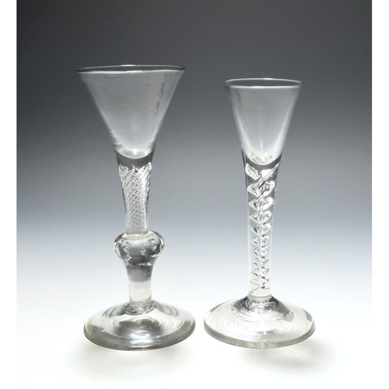 A composite stem wine glass, c.1750, the drawn funnel bowl raised on an airtwist stem above a plain baluster section enclosing two rows of tears, and a small wine glass with drawn trumpet bowl over a thick mercury twist, foot faults, 17.8cm max. (2)