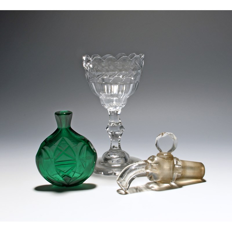 A sweetmeat glass, c.1760, the ogee bowl cut with flutes and a scalloped rim over a knopped faceted stem, an emerald green scent flask cut with a plain cartouche and a geometric design, and a glass barrel tap and stopper of pistol form, 16.8cm max. (4)