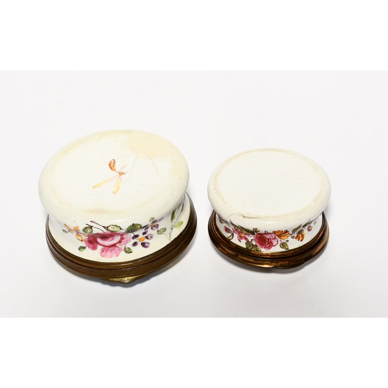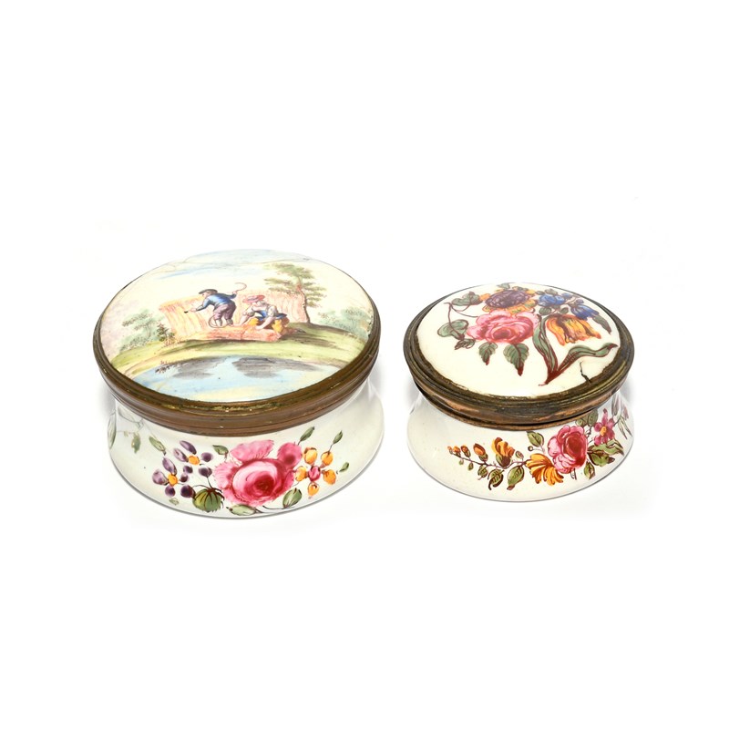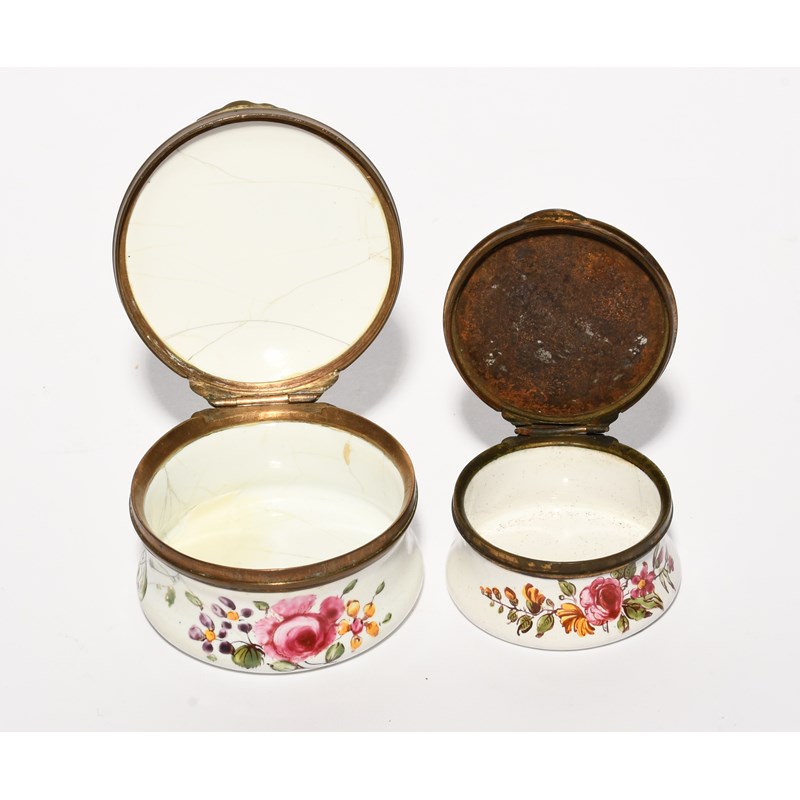 Two South Staffordshire patch boxes, c.1770, of circular form, one painted with flowers, the other