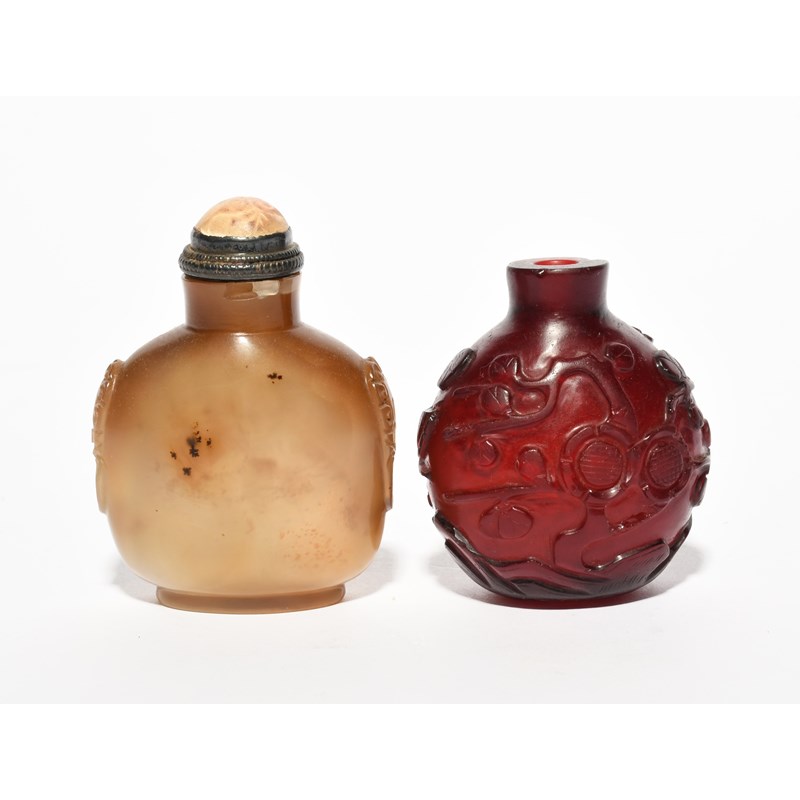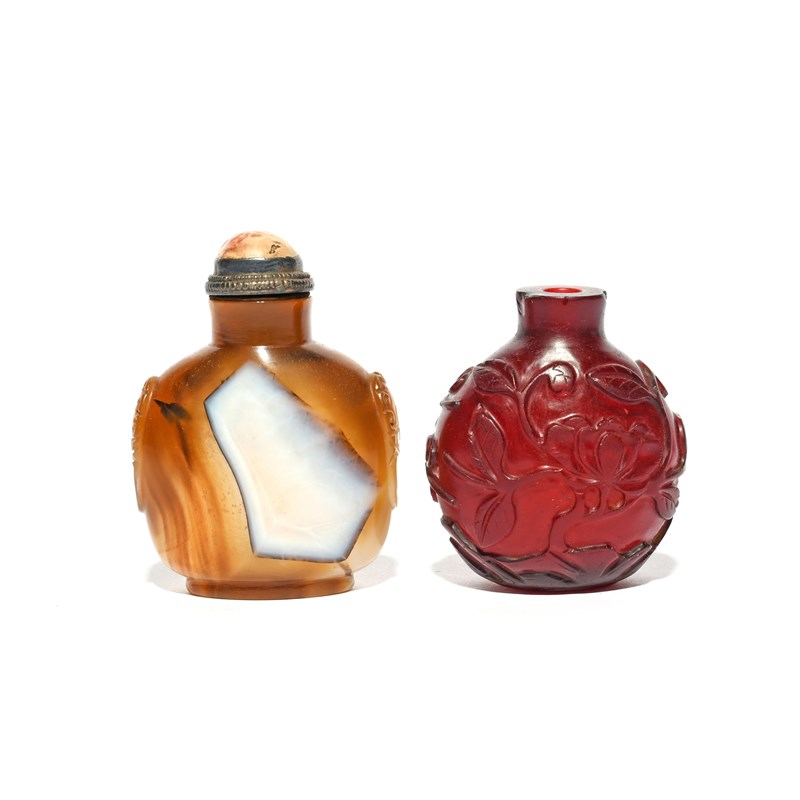 Two Chinese snuff bottles, 19th century, one red glass and carved with flowering magnolia, the other simulating agate, set with a metal-mounted stopper and spoon, the shoulders with stylised masks, small chips, 7.4cm. (2)