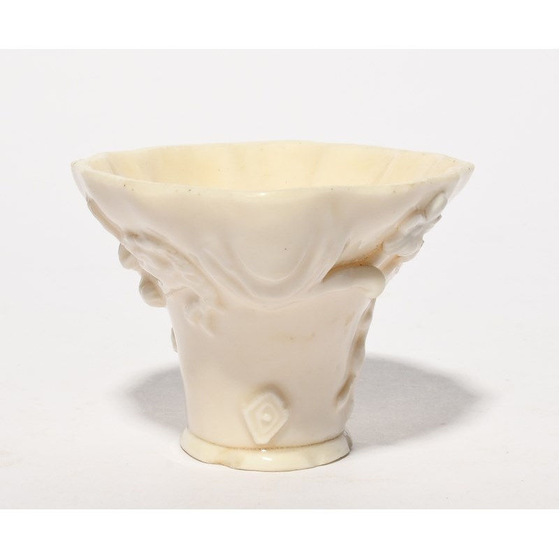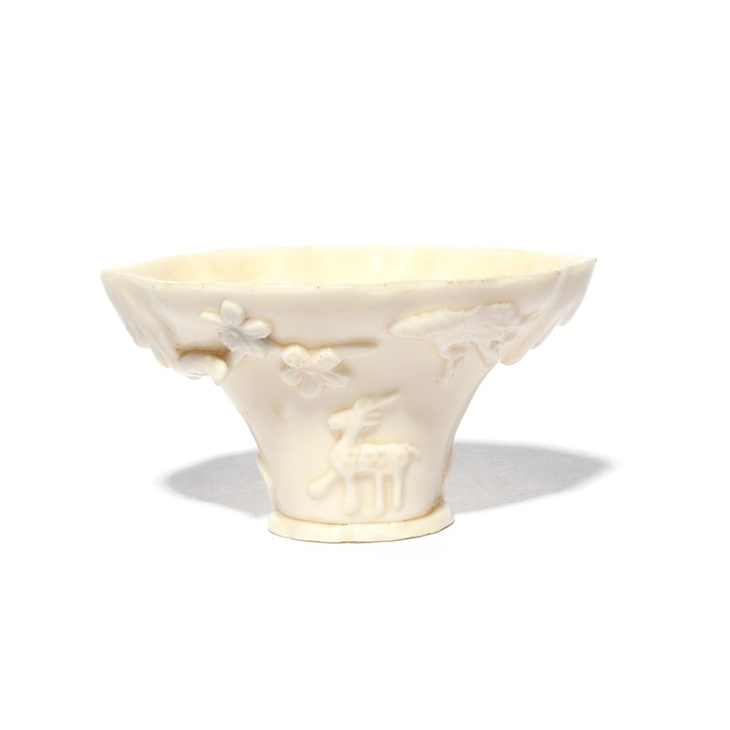 A Chinese blanc de Chine libation cup, Qing dynasty, sprigged with a deer, a kylin and birds beside