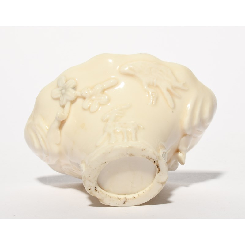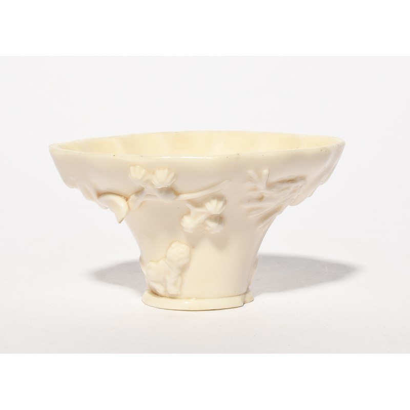 A Chinese blanc de Chine libation cup, Qing dynasty, sprigged with a deer, a kylin and birds beside prunus and pine branches, a chip to the foot, 5.5cm high.