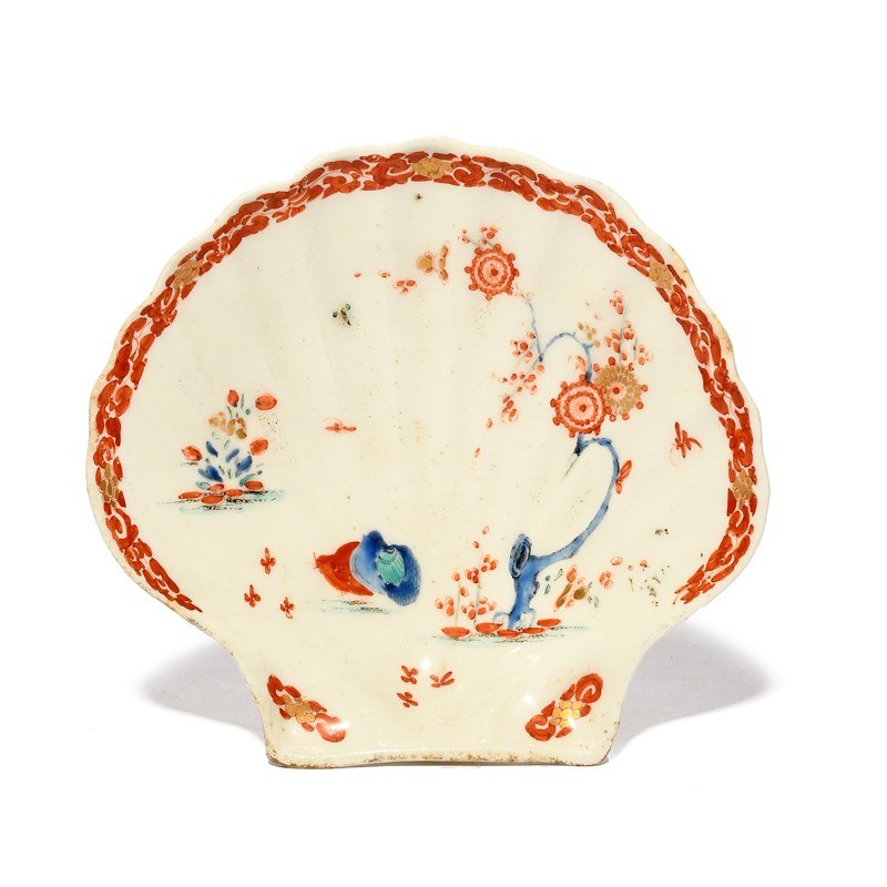 A Bow shell pickle dish, c.1756-60, the scallop shell form painted in the Kakiemon palette with the