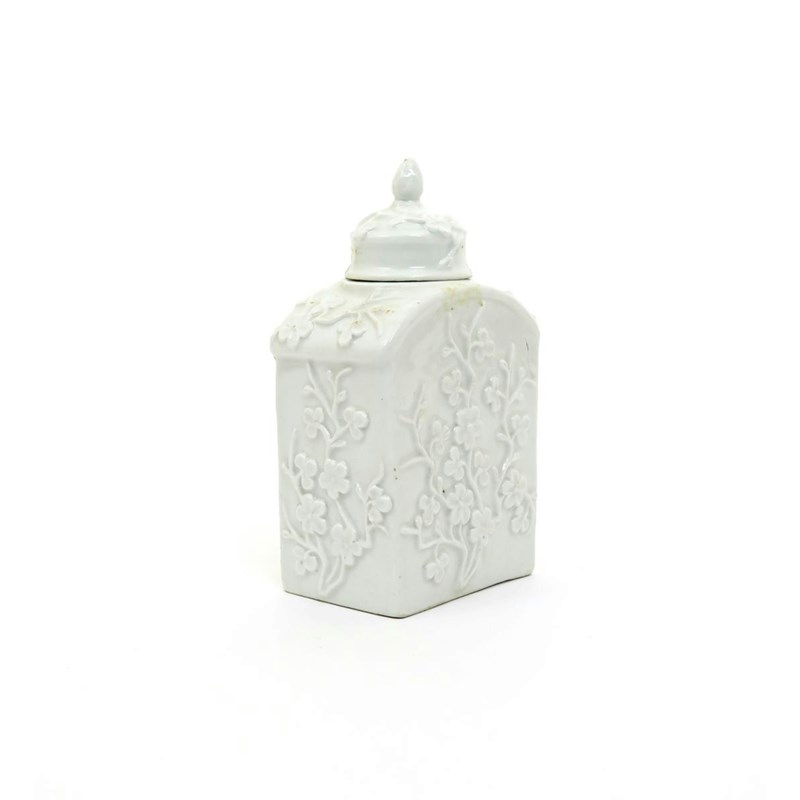 A Meissen rectangular tea canister and cover mid 18th century, applied with bold sprays of flowering prunus, blue crossed swords mark, minor damages, 13.3cm. (2)