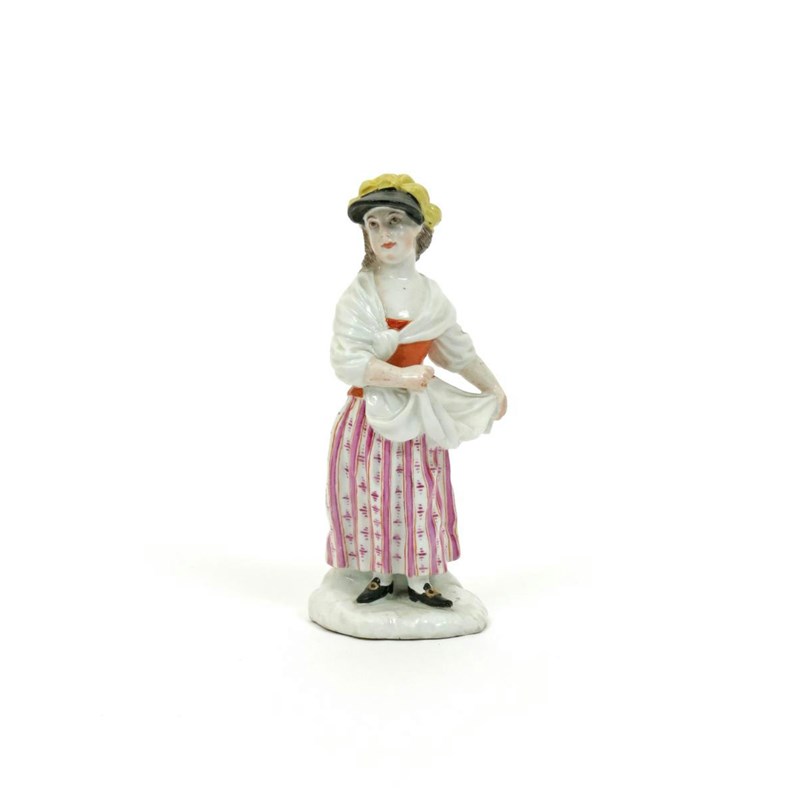 A Furstenberg figure of a dancing girl c.1770, holding a corner of her apron in each hand and twisting it away from her body, wearing a striped skirt and a yellow bonnet with a large black peak, blue F mark, 14.8cm.
