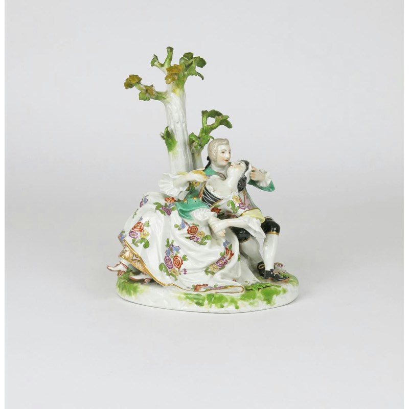 A Meissen-style crinoline figure group of lovers c.1770, after the model by J J Kändler, the amorous pair seated beneath a tree and enjoying an embrace, blue crossed swords and dot mark, some restorations, 19cm.