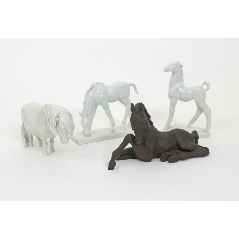 Four Meissen equestrian models modern, one of a Shetland pony standing four square with shaggy mane, one a young pony grazing, one of a foal standing with ears laid flat, the last in Böttger stoneware of a recumbent foal cleaning his leg, incised and painted crossed swords marks, 24cm across max. (4)