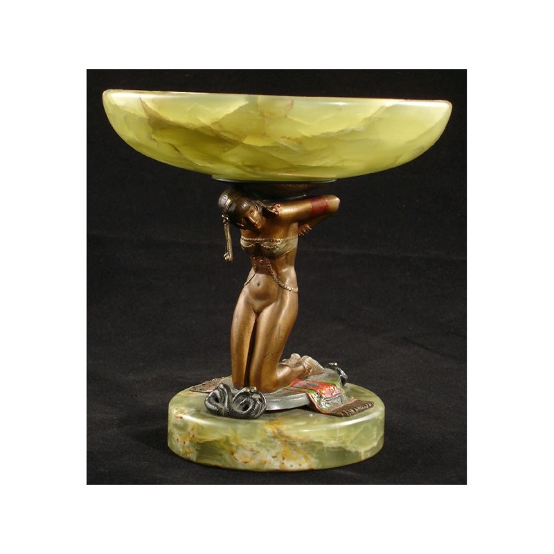 A cold painted bronze figural tazza in the style of Bergman, with onyx base and bowl unsigned 17cm. high