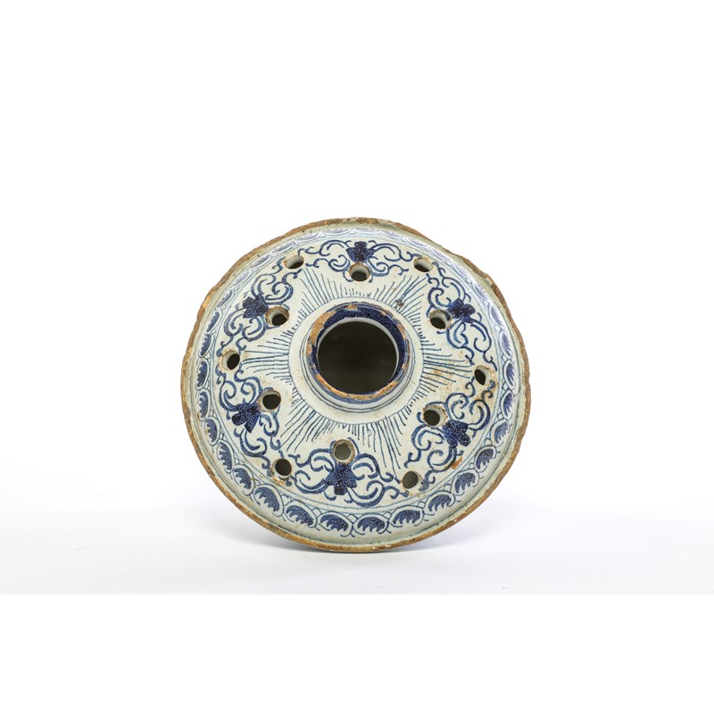 of 'bowl and cover' form with a central larger aperture surrounded by two bands of smaller holes, with flowering foliate decoration