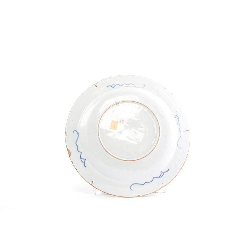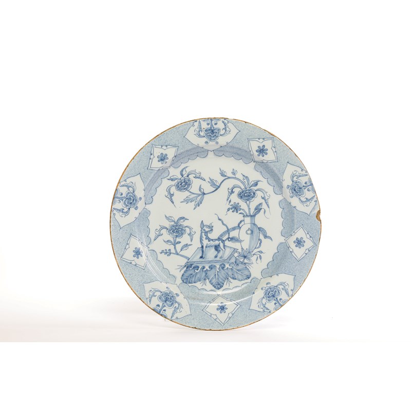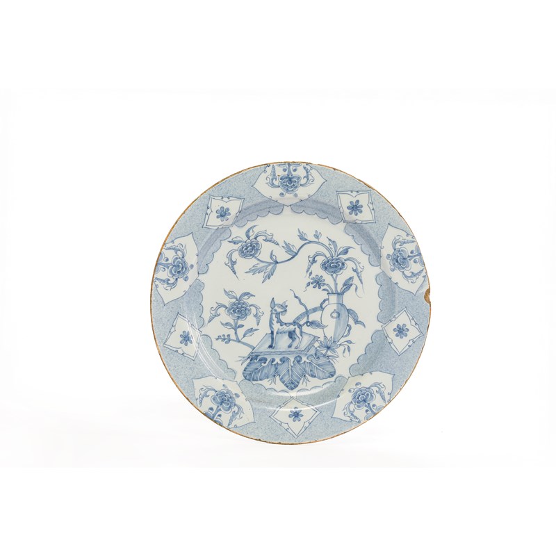painted with a dog or fox beside a vase with scrolling foliage, inside a border with lozenge floral panels on a powder blue ground and with an ochre rim