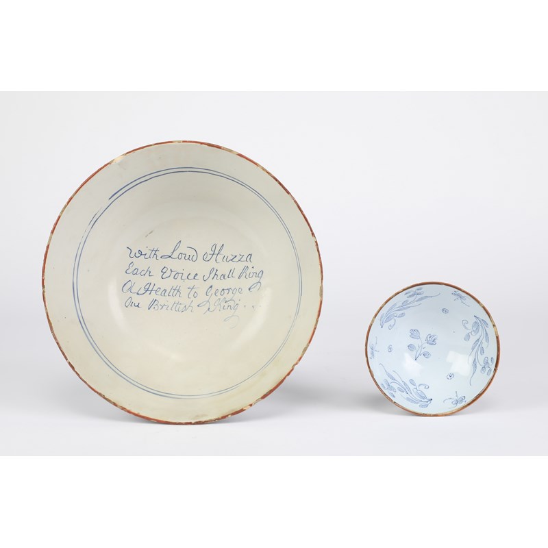 the interior with a four line rhyme in support of King George, the exterior with blue painted ogee panels on a powdered manganese ground, together with a small bowl, the interior with line drawn foliage, the exterior with a powdered manganese ground (2)