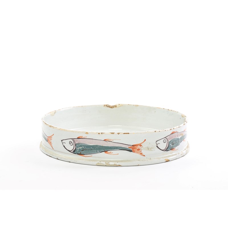 of shallow circular form, painted to the exterior with five fish in manganese, green and red