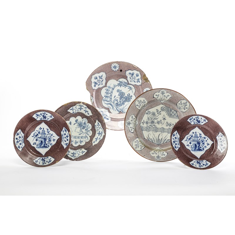 A GROUP OF DELFTWARE PLATES WITH POWDERED MANGANESE GROUNDS