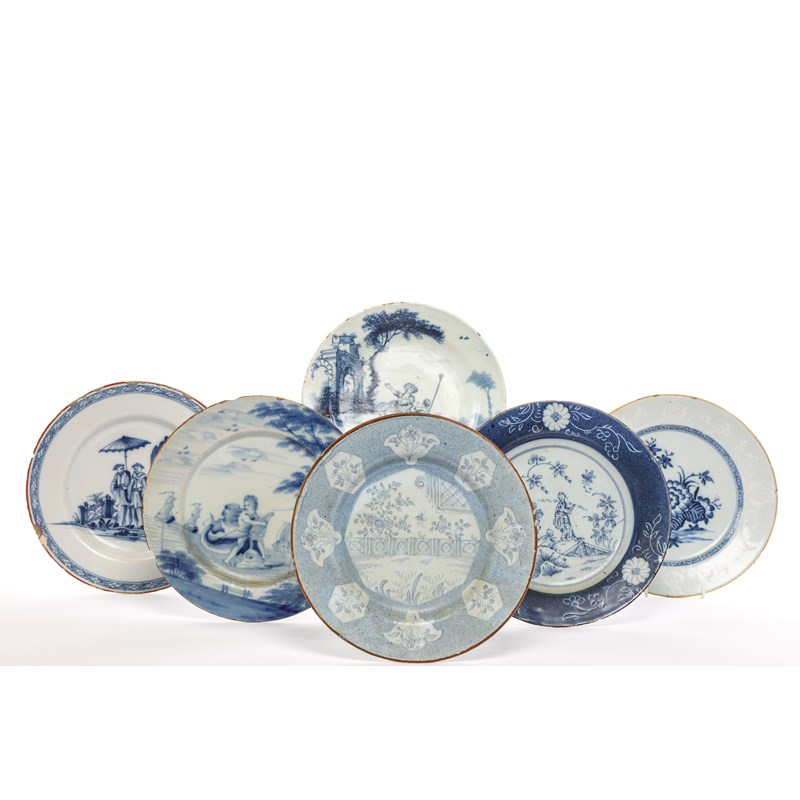 comprising: a London plate with a Chinaman and foliage inside a powdered blue border, one with a chinoiserie fenced garden scene inside a powdered pale blue border, one with two figures by a rock and before a ruin, an English plate with two Chinamen beneath a parasol and before a fence and mountain, another with a chinoiserie chrysanthemum and bamboo scene inside a bianco sopra bianco border and a Dutch plate with a child playing a lyre before three sailing ships (6)