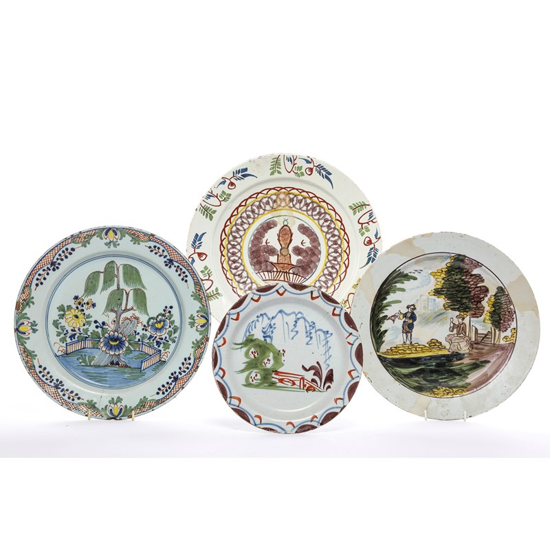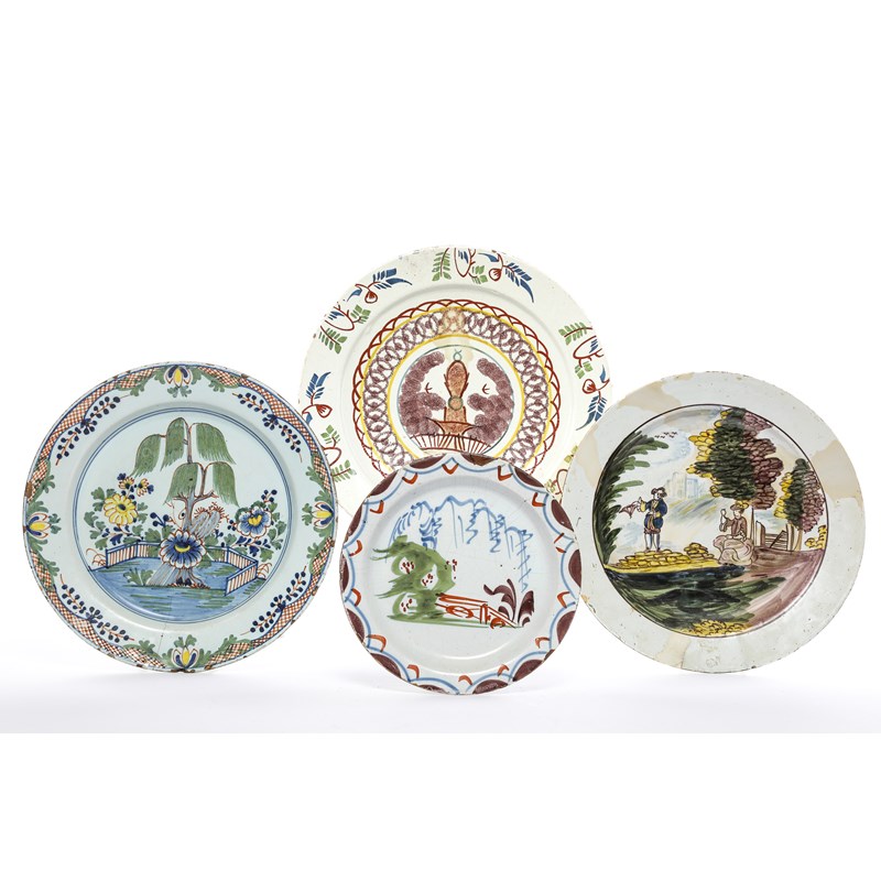 polychrome painted with a chinoiserie scene of a willow in a fenced garden, together with a charger, London, probably by William Griffith, polychrome painted with a pagoda behind a fence and flanked by sponged foliage, a polychrome plate also probably by William Griffith and a Liverpool charger polychrome painted with a couple in a landscape (4)