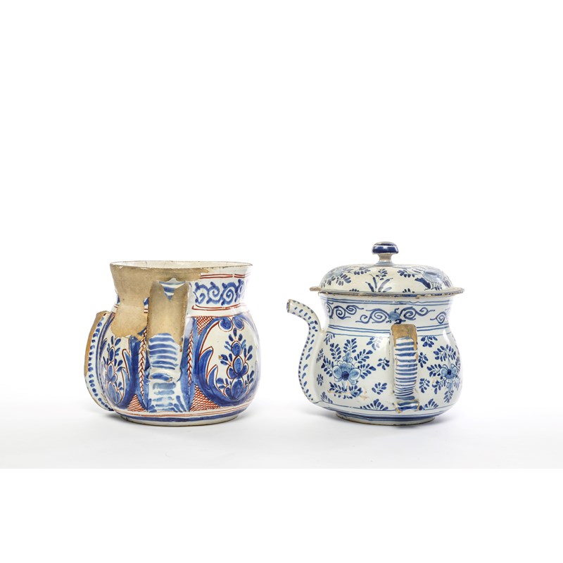 painted with flowers between a pair of handles and a spout with blue dashes, with a domed cover, together with another posset pot, with foliate panels in blue and red between handles with blue dashes (3)
