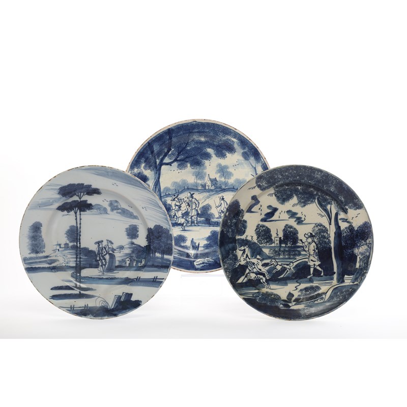 painted with a couple in a landscape with sponged trees, together with two Dutch chargers, each with figures in landscapes with sponged trees and foliage (3)