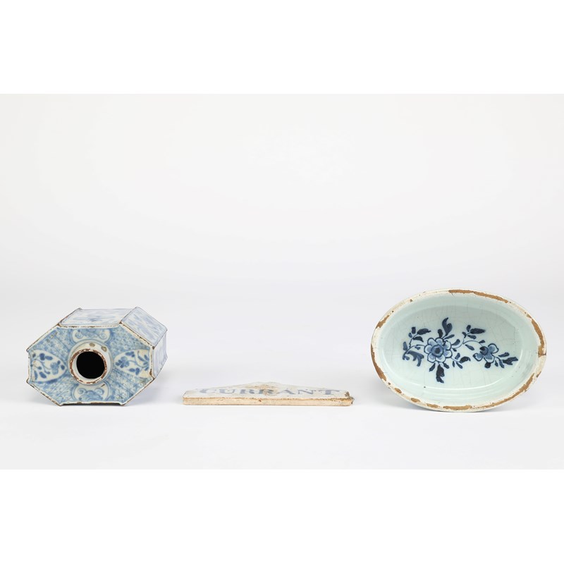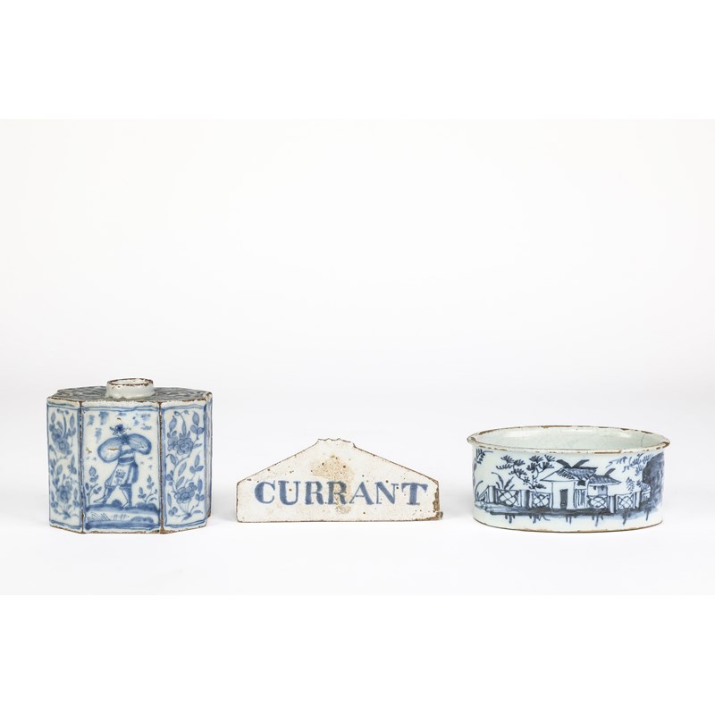 of octagonal form, blue painted with figures and flowering foliage, an oval butter dish, painted with a house in a fenced garden and a wine bin label inscribed 'CURRANT' in blue (3)