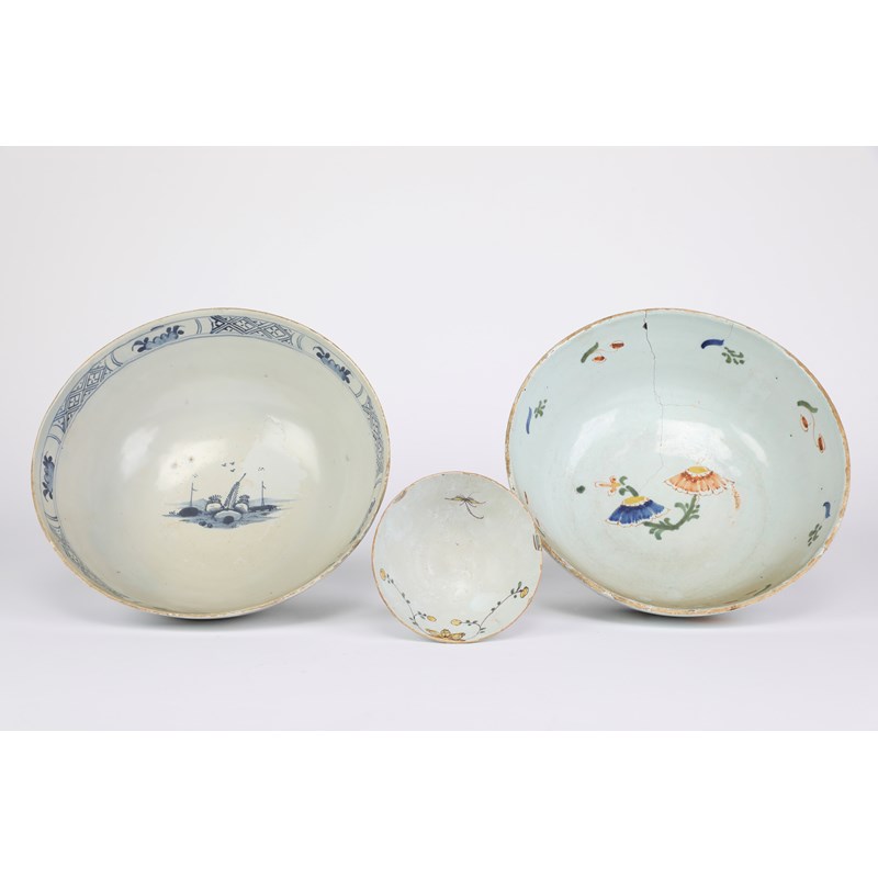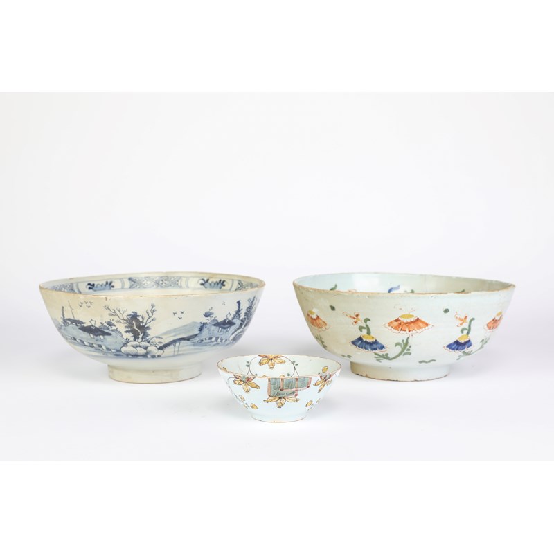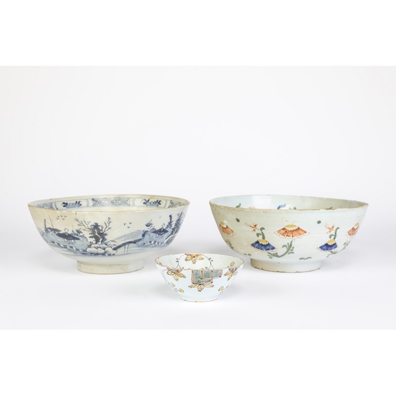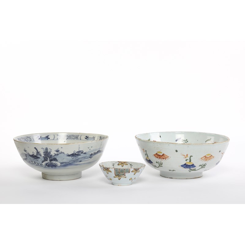polychrome painted with echinacea or cone flowers, a blue and white punch bowl painted with chinoiserie lakeside scenes and a small polychrome bowl painted with meandering flowering foliage (3)