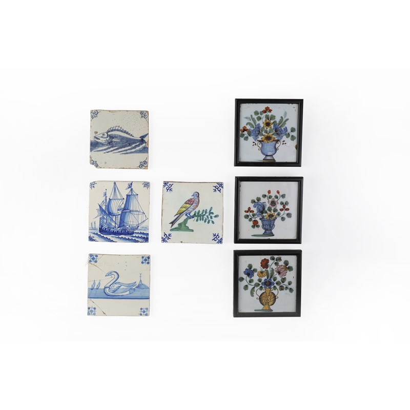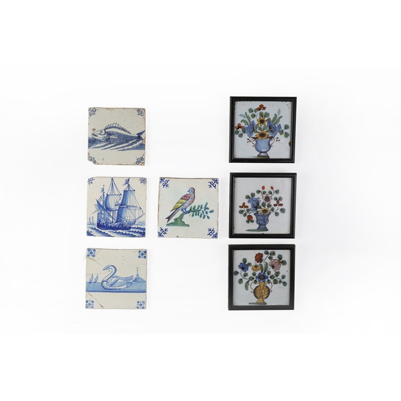 polychrome decorated in the Fazackerly palette with vases of flowers (framed), together with four further delftware tiles to include examples painted with a large fish, a three masted ship, a swan and a Bristol polychrome painted dove (7)