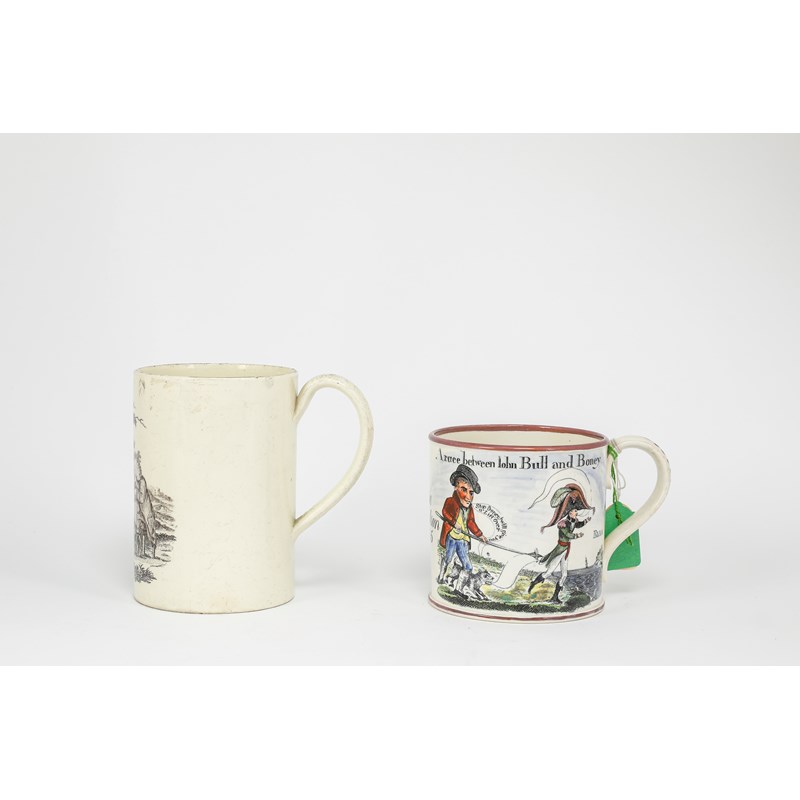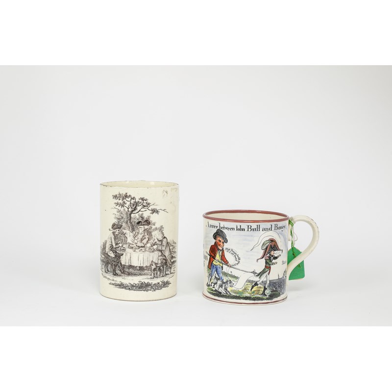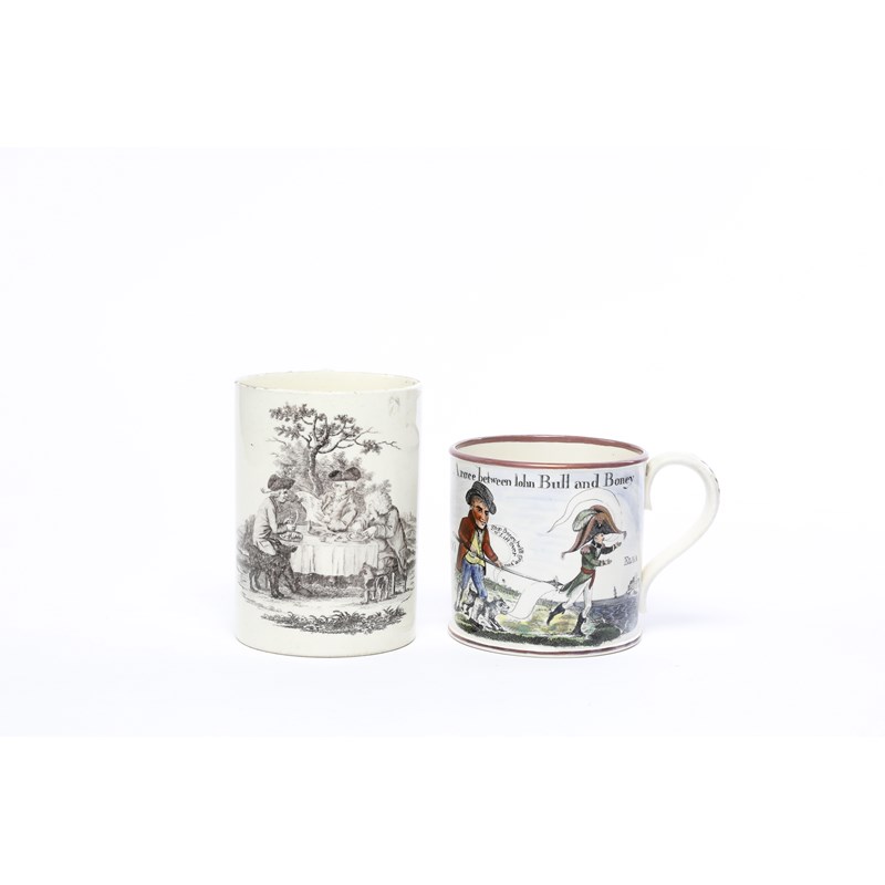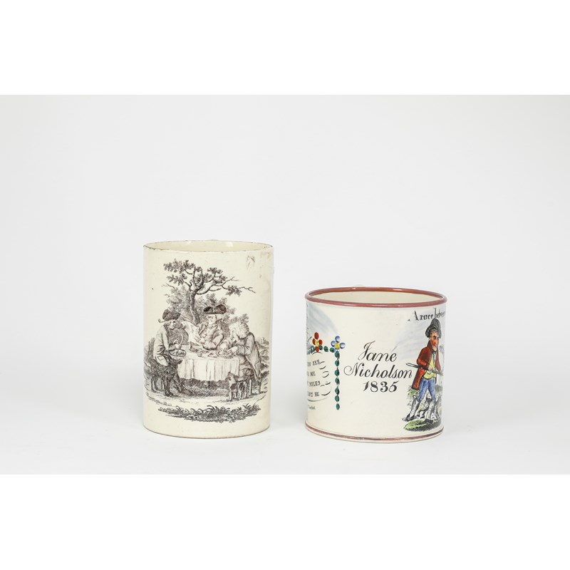 decorated with three men eating at a table beneath a tree, one reading a newspaper, with two dogs at their feet, together with a creamware mug printed and painted with a satirical print, after Dawson, titled 'A race between John Bull and Boney' and inscribed 'Jane Nicholson 1835' (2)