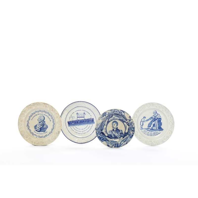 comprising: one titled 'Sacred Memory of George III Who died 29 Jany 1820', one inscribed 'Part of the Funeral Procession of Caroline the Injured & Persecuted Queen of Great Britain', with an impressed crown mark, another with George III passing a bible to a child and inscribed 'I hope the time will come when every poor child in my dominions will be able to read the Bible', the fourth celebrating Lord Wellington Peninsular Campaign battles with his portrait and inscribed with his name and the names of three battles (4)