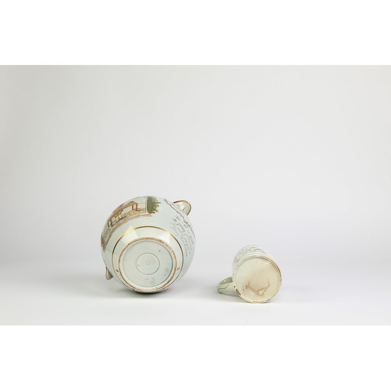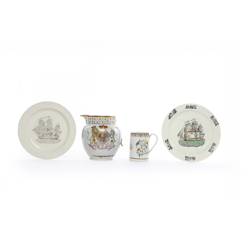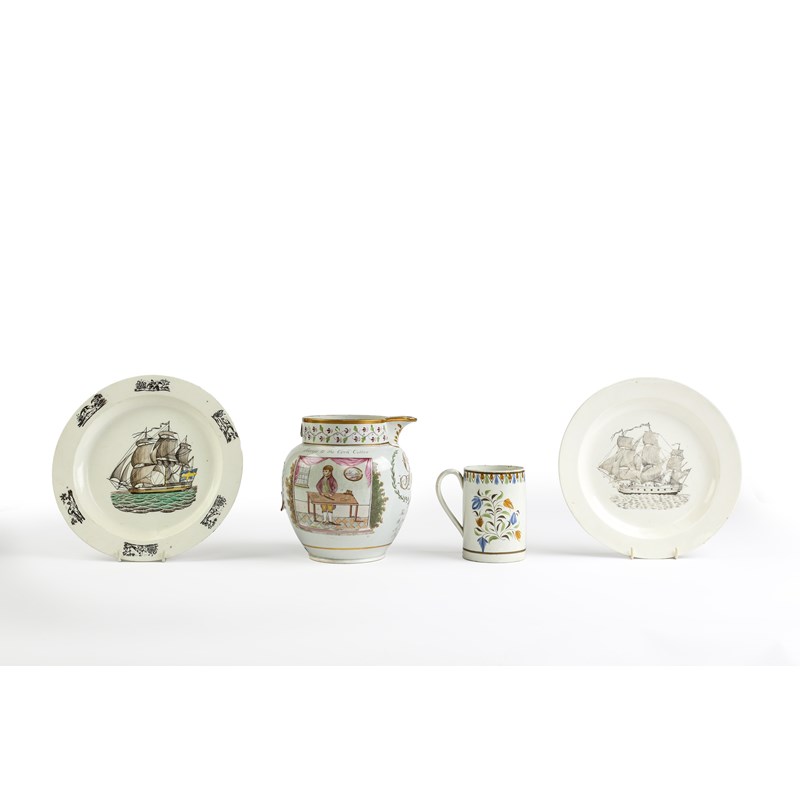 painted with a cork cutter standing before a table in a furnished interior beneath the inscription 'Success to the Cork Cutter', with a gilt 'GR', a four line drinking stanza and a Royal Crest, together with two Liverpool printed creamware shipping plates and a pearlware mug with stylised floral decoration (4)