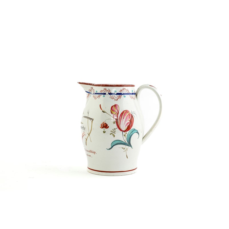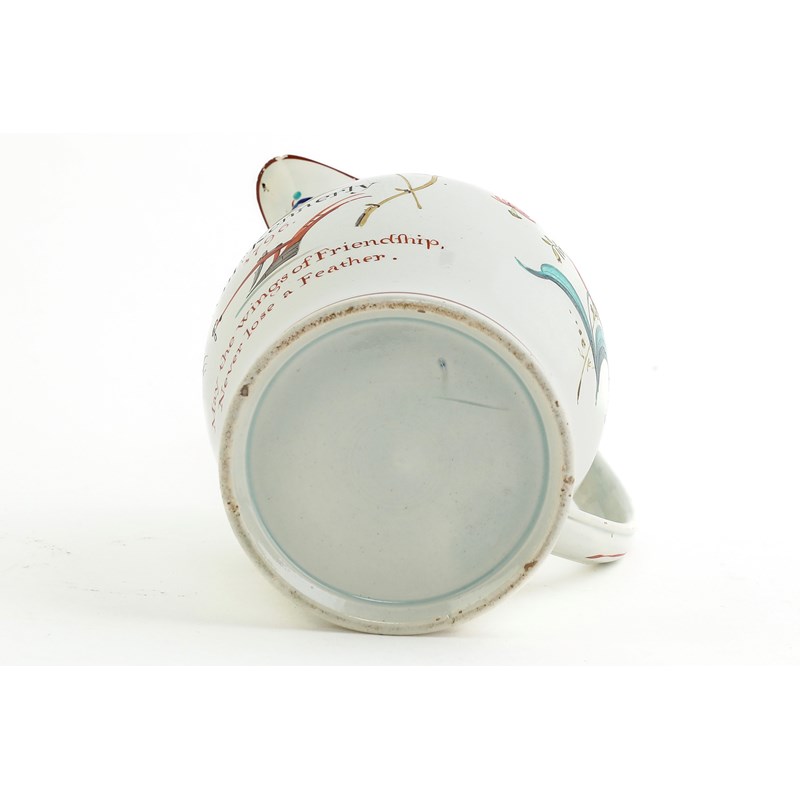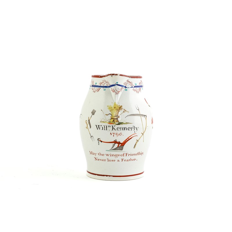 of slightly swollen form, with a painted inscription 'Willm. Kennerly 1796. May the wings of Friendship, Never lose and Feather', surrounded by flowers and farm tools