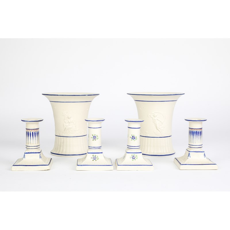 A PAIR OF CASTLEFORD-TYPE VASES AND TWO PAIRS OF CANDLESTICKS