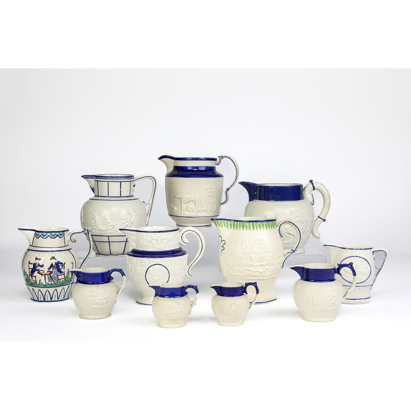 moulded with classical, bucolic and hunting scenes, one depicting Lord Nelson and HMS Victory, one with crowns and feathers, another with peacocks, one hunting jug marked Davenport (11)