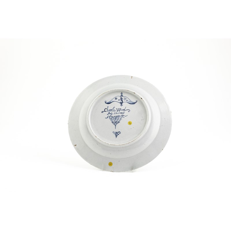 painted in underglaze blue with a flowering auricula, the reverse with the inscription 'Charles+Ward July the 5 1766' between 'doodle' like decoration of a bird, cross and heart motifs, and 'C' and 'S' scrolls