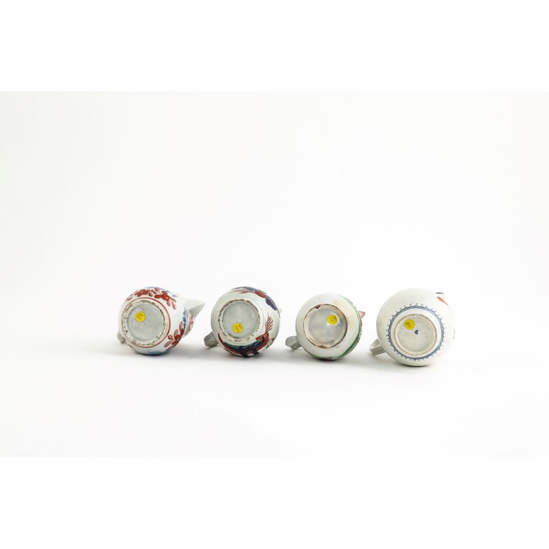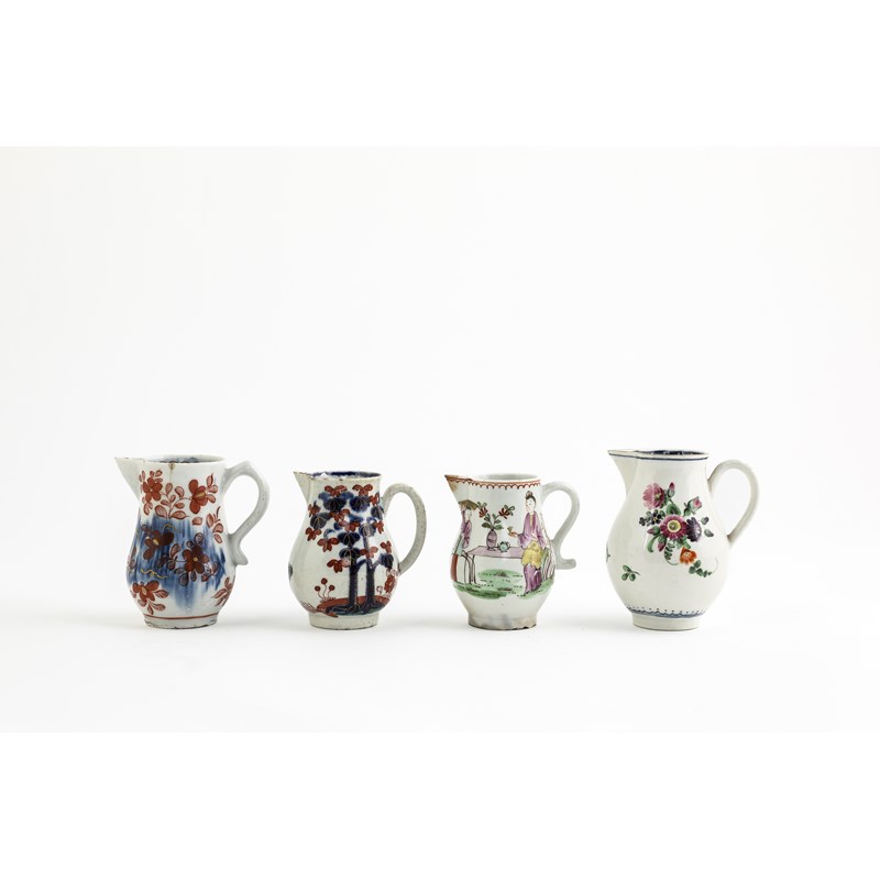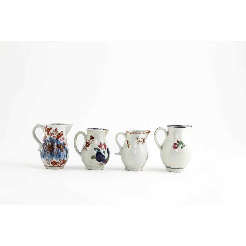 painted with a floral spray and sprigs beneath a blue and gilt rim, together with another Worcester jug, a Liverpool jug and another (4)