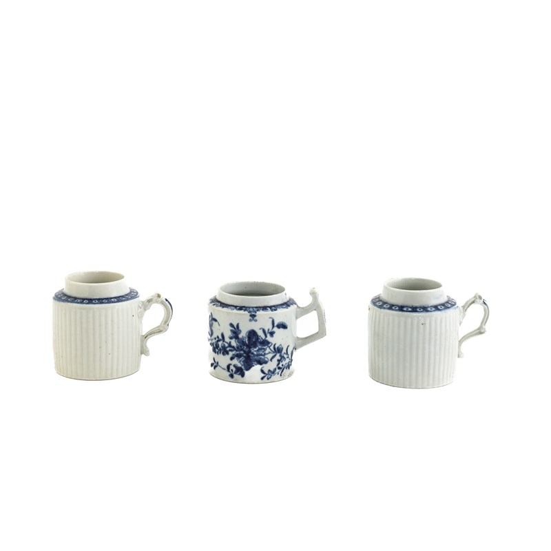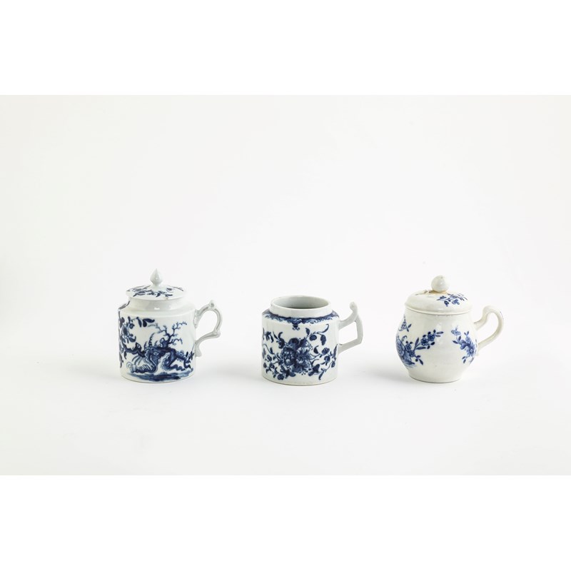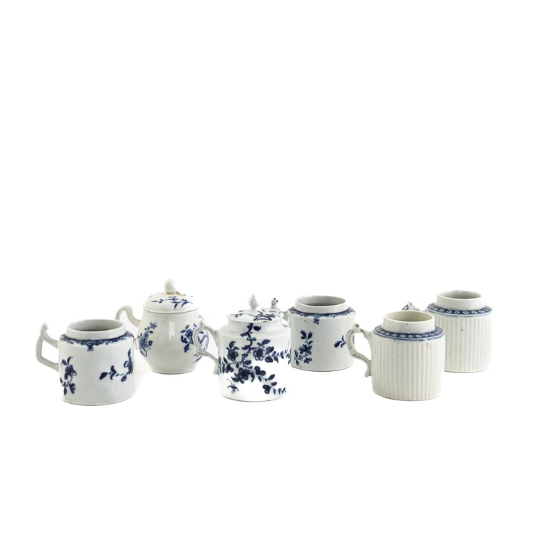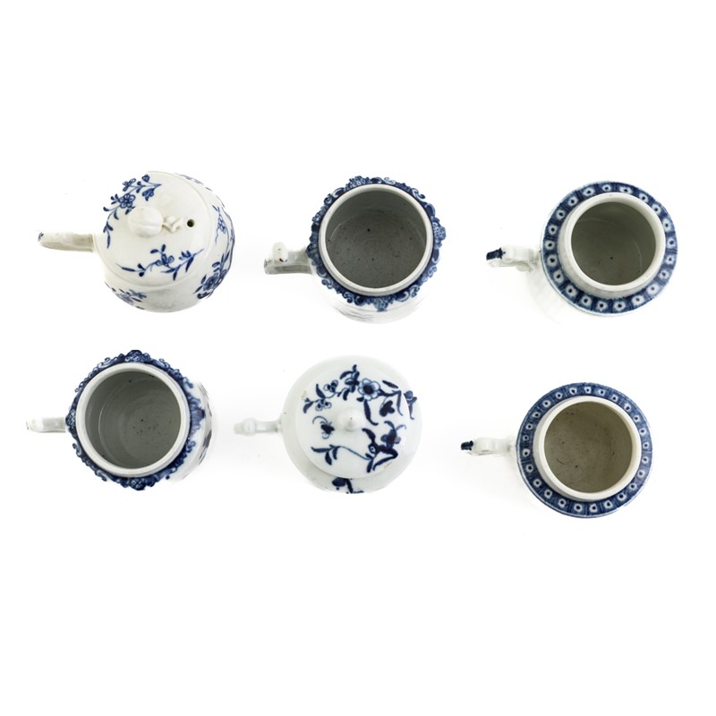 A COLLECTION OF FIVE WORCESTER BLUE AND WHITE MUSTARD POTS