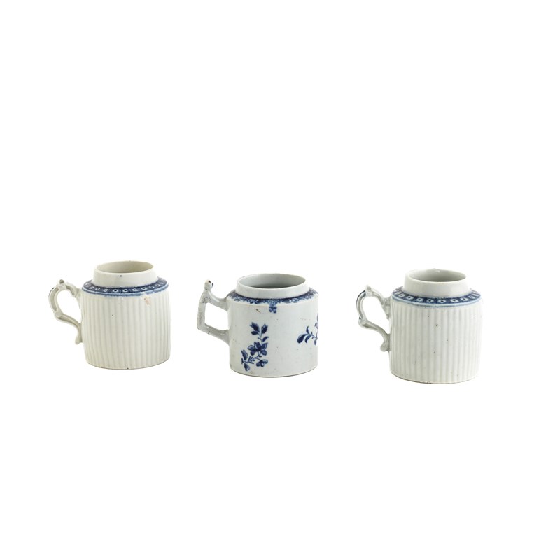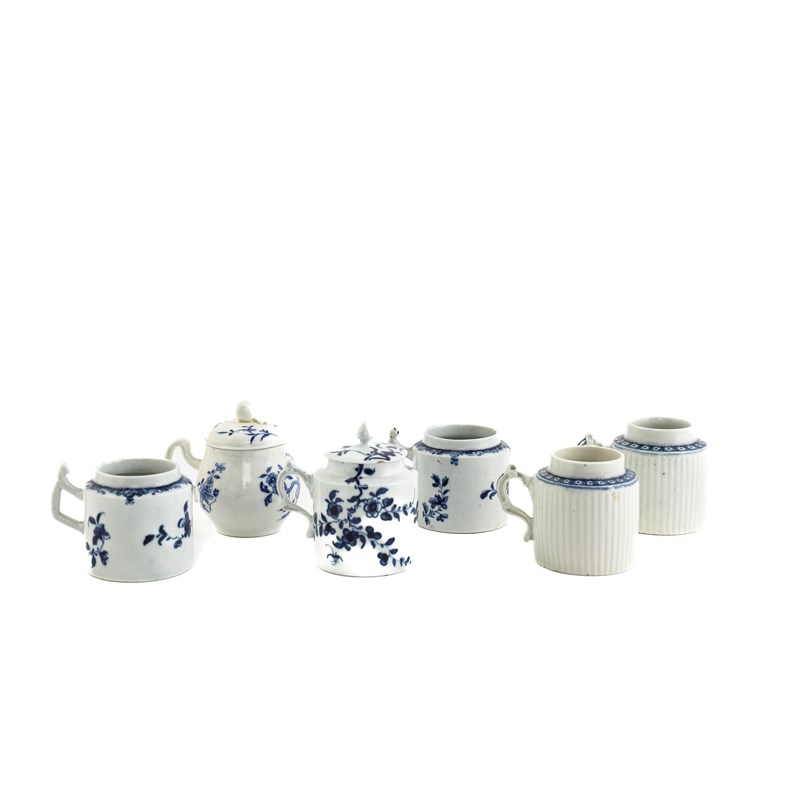 comprising: two painted in the Mansfield pattern, two of reeded form with border '34' to the shoulders, a mustard pot and cover in a version of the Prunus Root pattern and a Tournay custard cup and cover blue painted with flowers and foliage (8)