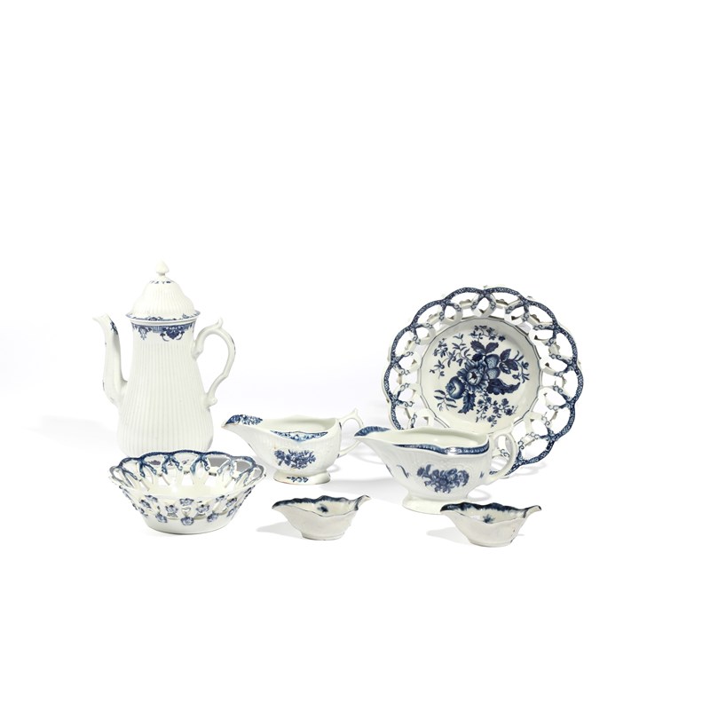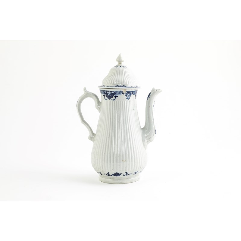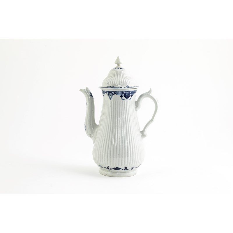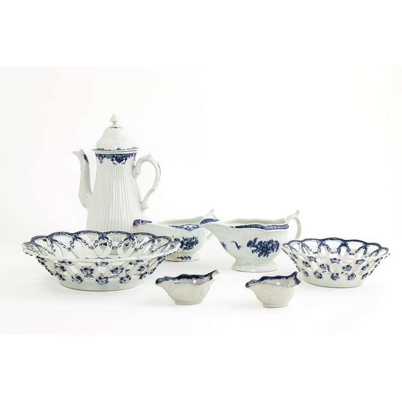 printed in the Pine Cone pattern, a sauce boat in the Three Flowers pattern, another in a version of the Strap Fluted Floral pattern, a pair of butter boats and a reeded coffee pot and cover of baluster form with painted border '48' (8)