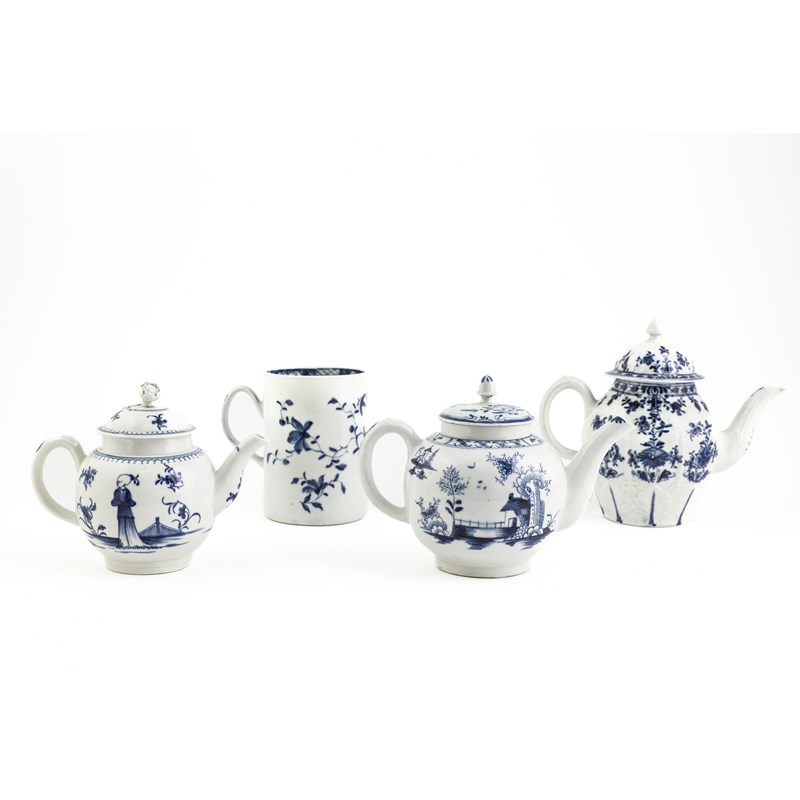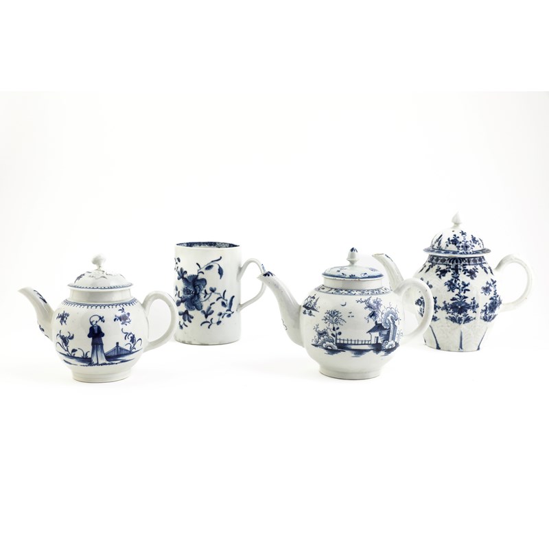 painted in the Waiting Chinaman pattern, together with a Philip Christian (Liverpool) teapot and cover, with floral panels inside moulded arches, a Lowestoft teapot and replacement cover, painted in the Island House pattern and a Worcester mug painted in the Mansfield pattern (7)
