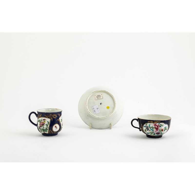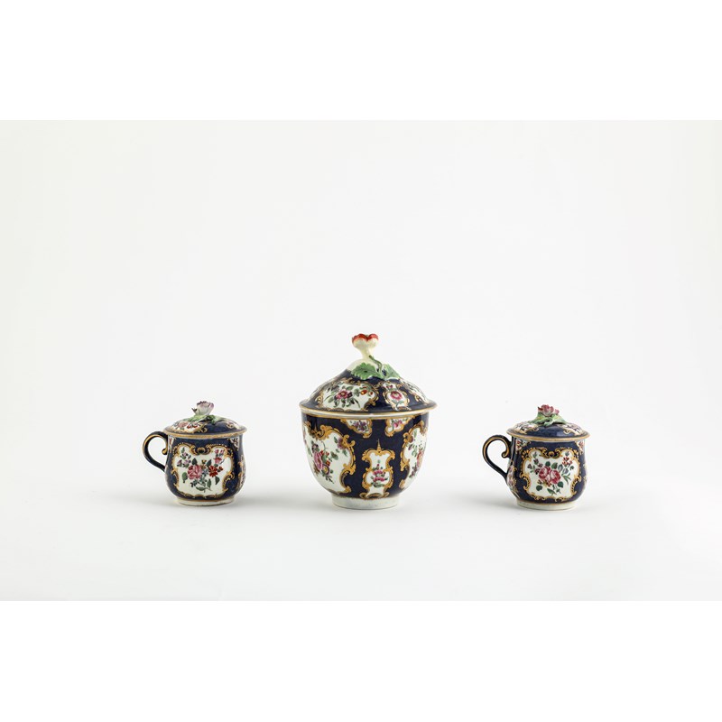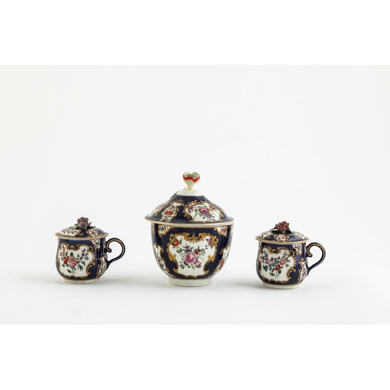 comprising: two scale ground plates, one with floral reserves the other with birds, two custard cups and covers with floral reserves, an ice cup with fan shaped reserves with birds on a powder ground, a tea cup and saucer with floral reserves on powder grounds and a sucrier and cover with floral reserves on a scale ground (11)