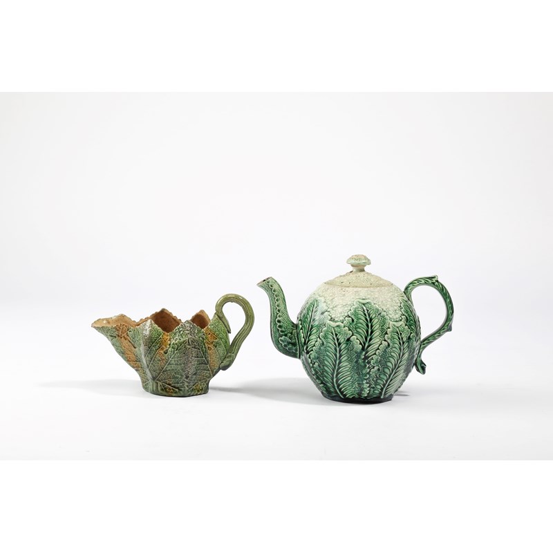 the cover and shoulders as the cream flower, the base, spout and handle as green foliage, together with a sauceboat cast as overlapping vine leaves in Whieldon type colours (3)