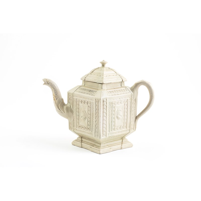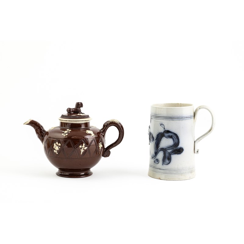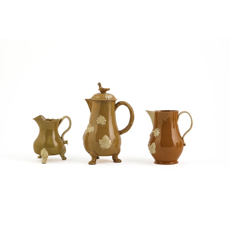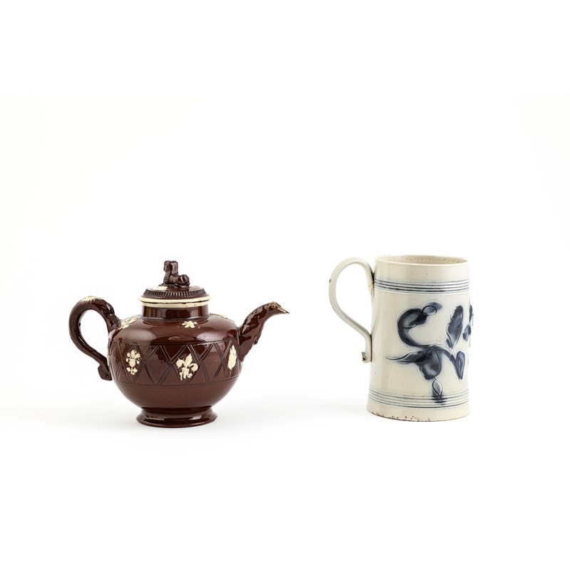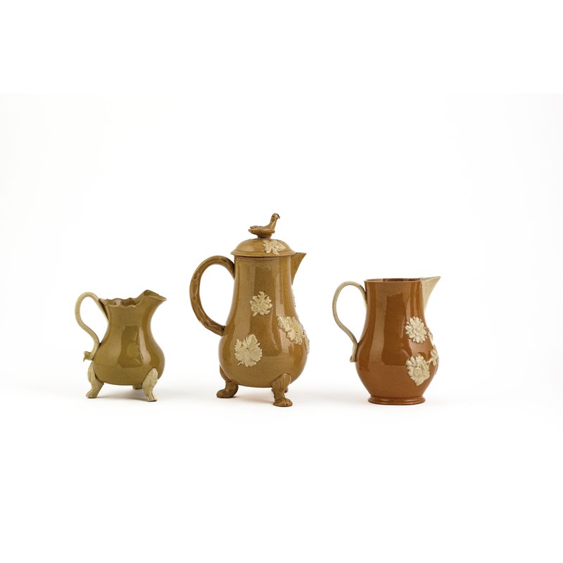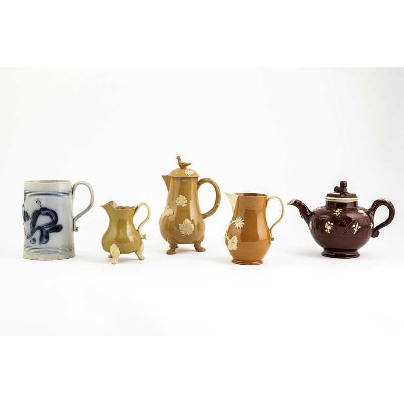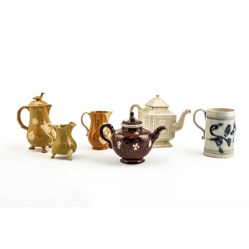 of cylindrical form, with a blue floral design and applied with a 'GR' beneath a crown, together with a salt-glazed stoneware teapot and cover of lozenge form, an 'orangeware' sparrow beak jug, a buff stoneware chocolate pot and cover, a buff stoneware silver-shaped cream jug and a redware teapot and cover with cream coloured relief decoration (9)