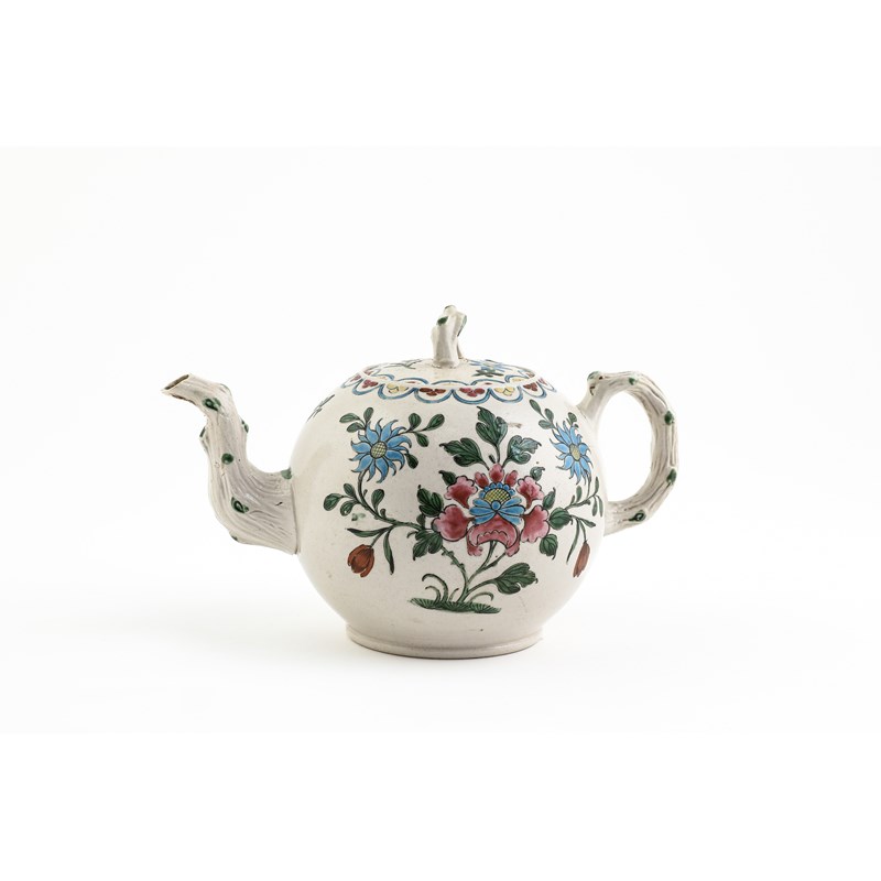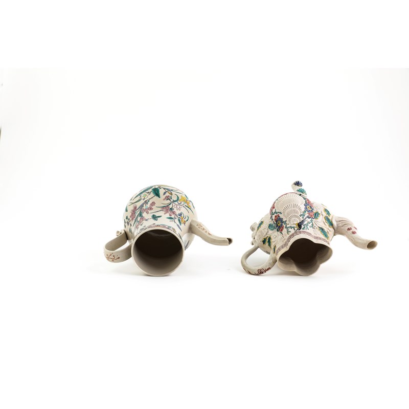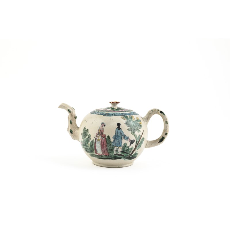 each with a crabstock handle, spout and cover finial, two enamelled with floral designs, one with a couple in a garden, a house verso, and a smaller example with a floral design (8)
