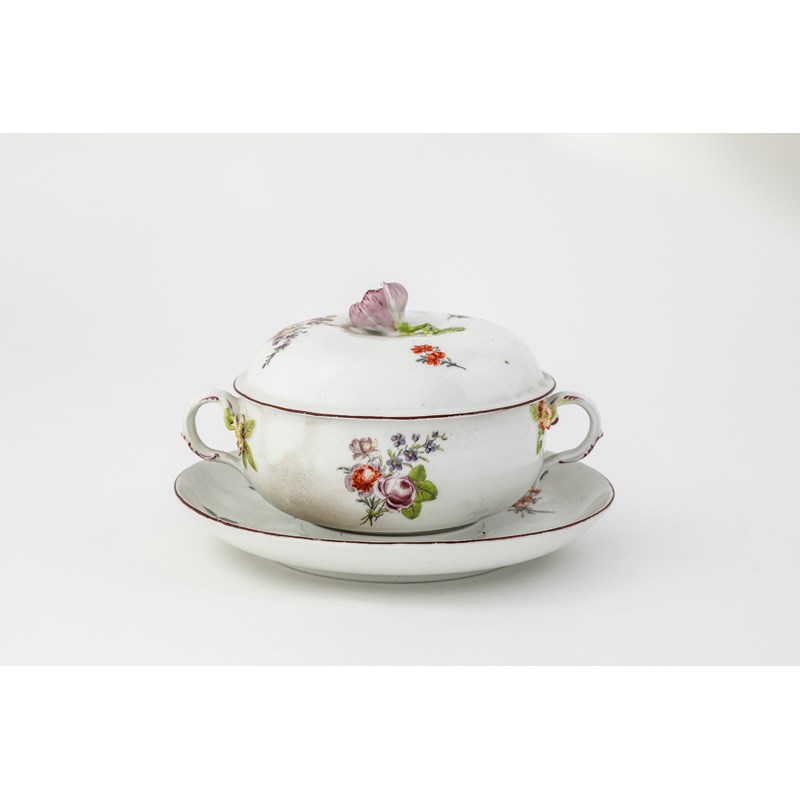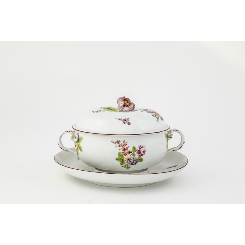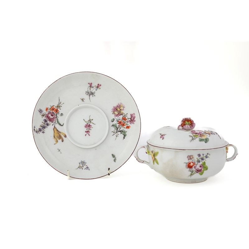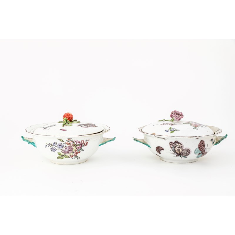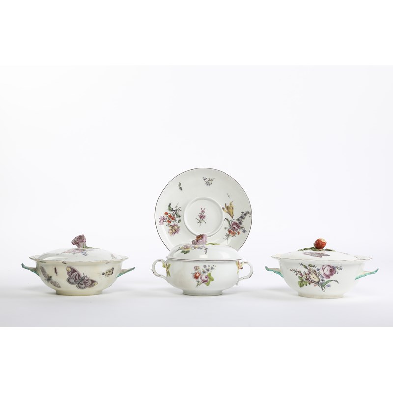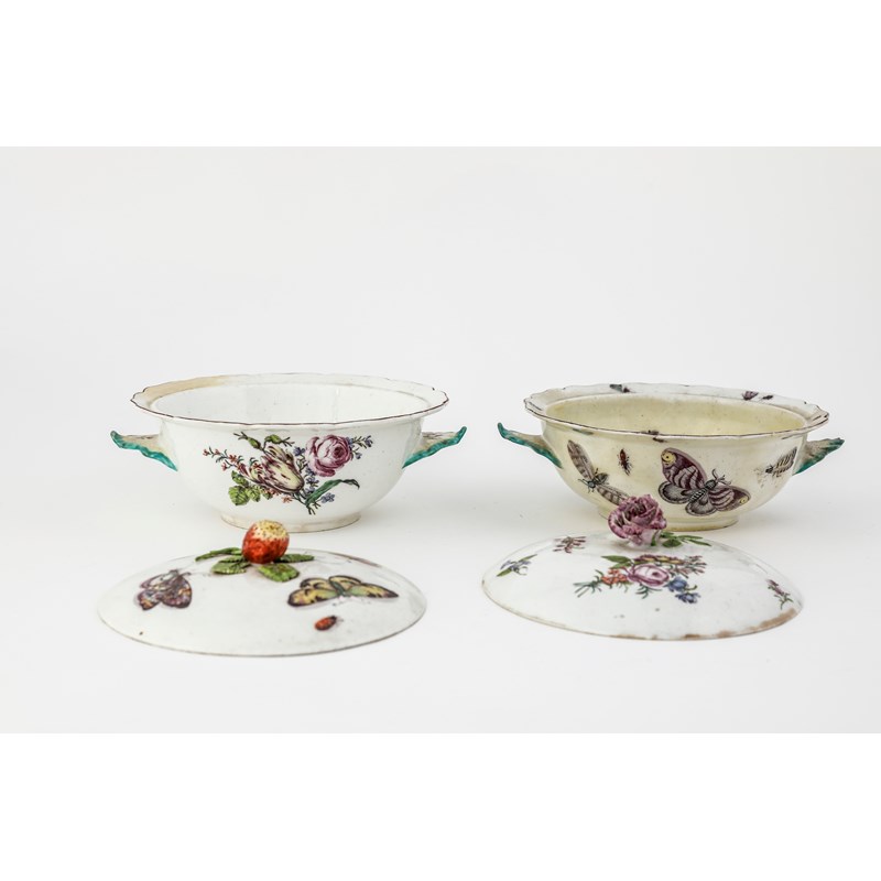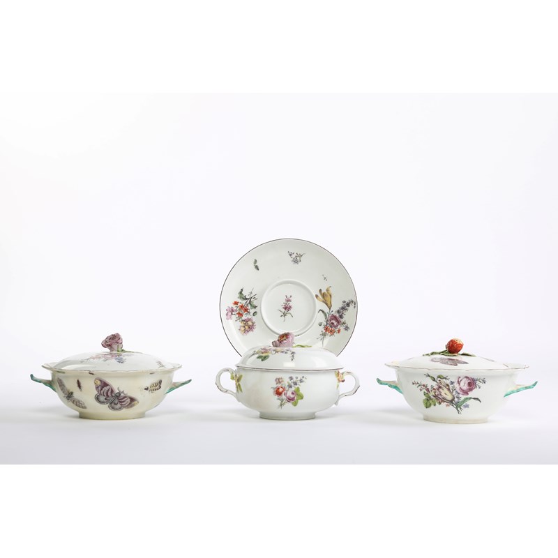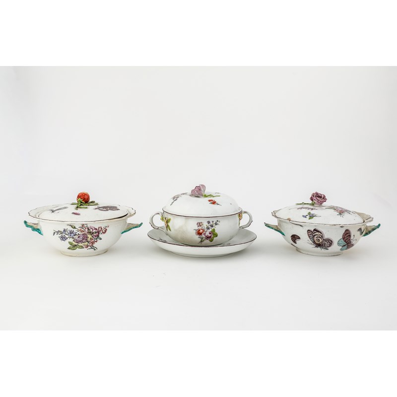 together with two Chelsea tureens and covers, all decorated with flowers sprays and brown line borders, red anchor marks (7)
