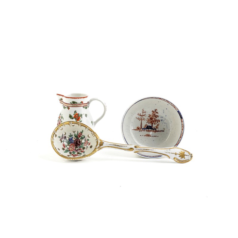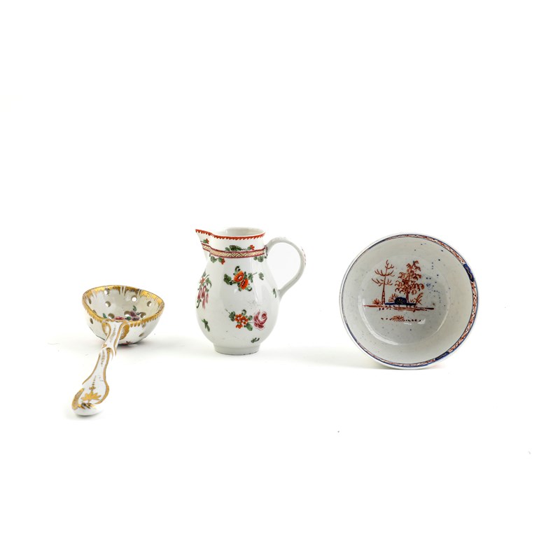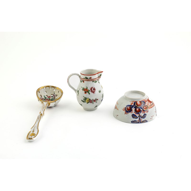 enamelled with flowers inside a feathered gilt rim and with a rococo style handle, together with a Bristol porcelain sparrow beak cream jug enamelled with floral sprigs and a Vauxhall teabowl, painted in the imari palette with a chinoiserie figural scene (3)