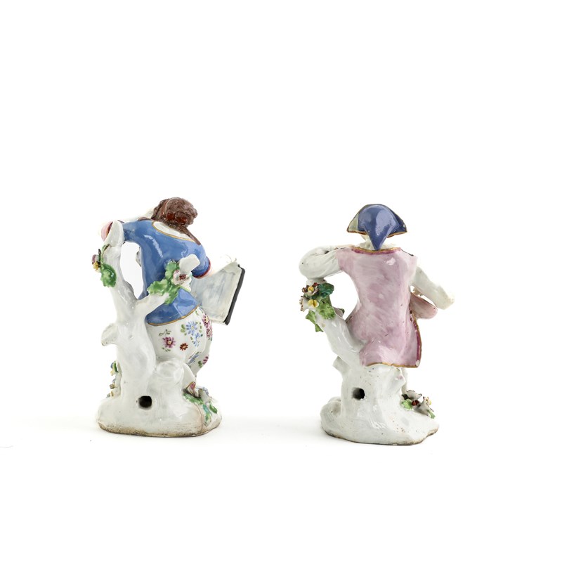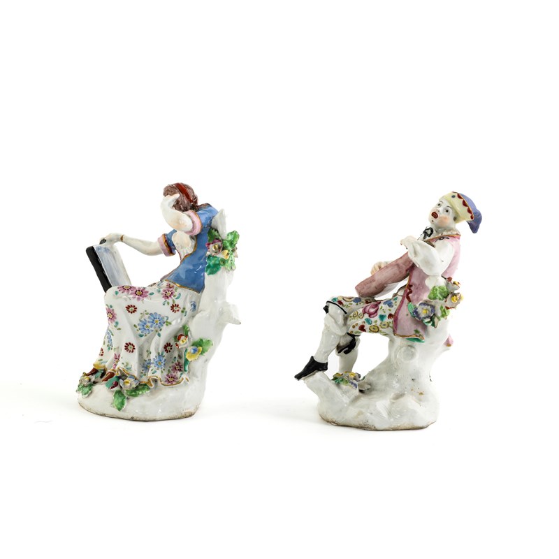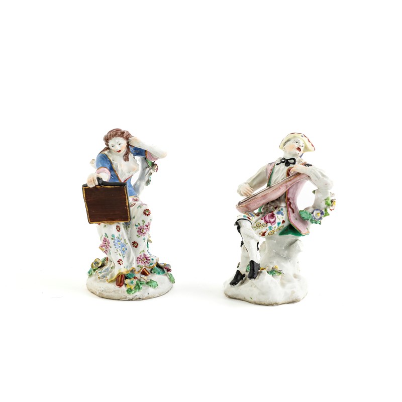 he seated playing a mandolin, together with a Bow figure emblematic of Sight, a maiden seated looking into a mirror (2)