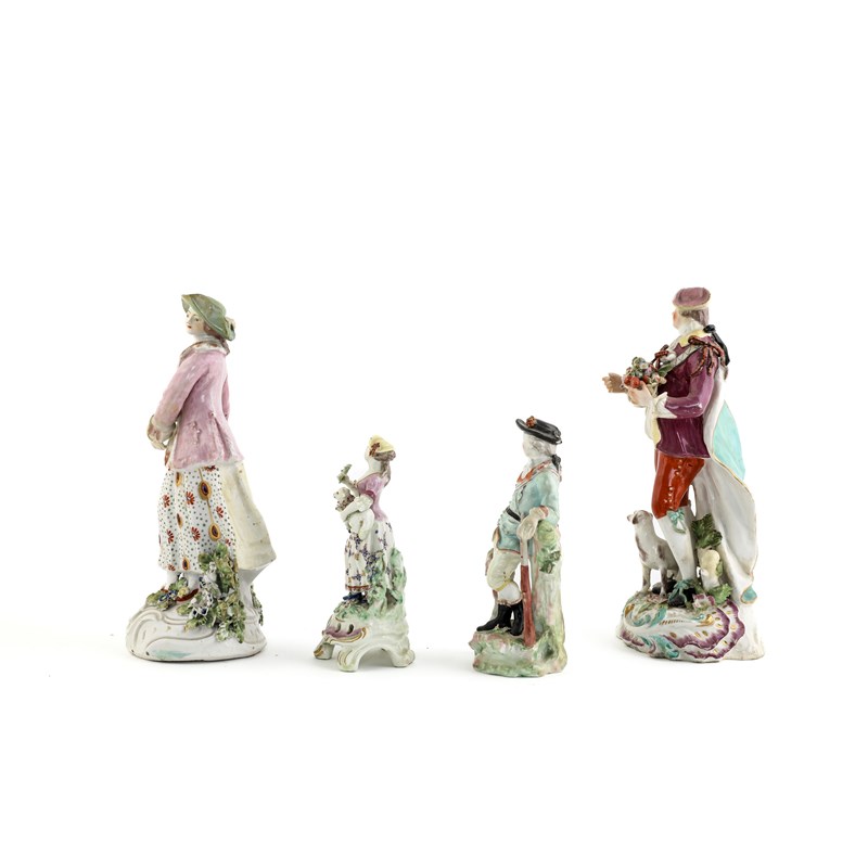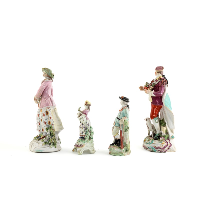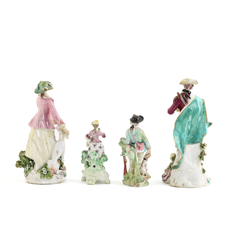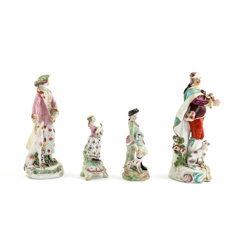 he standing holding a basket of fruit and flowers, she with a hound at her feet, together with a smaller Derby figure of a huntsman and an English porcelain figure of a shepherdess (4)