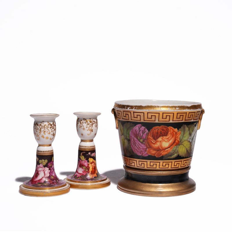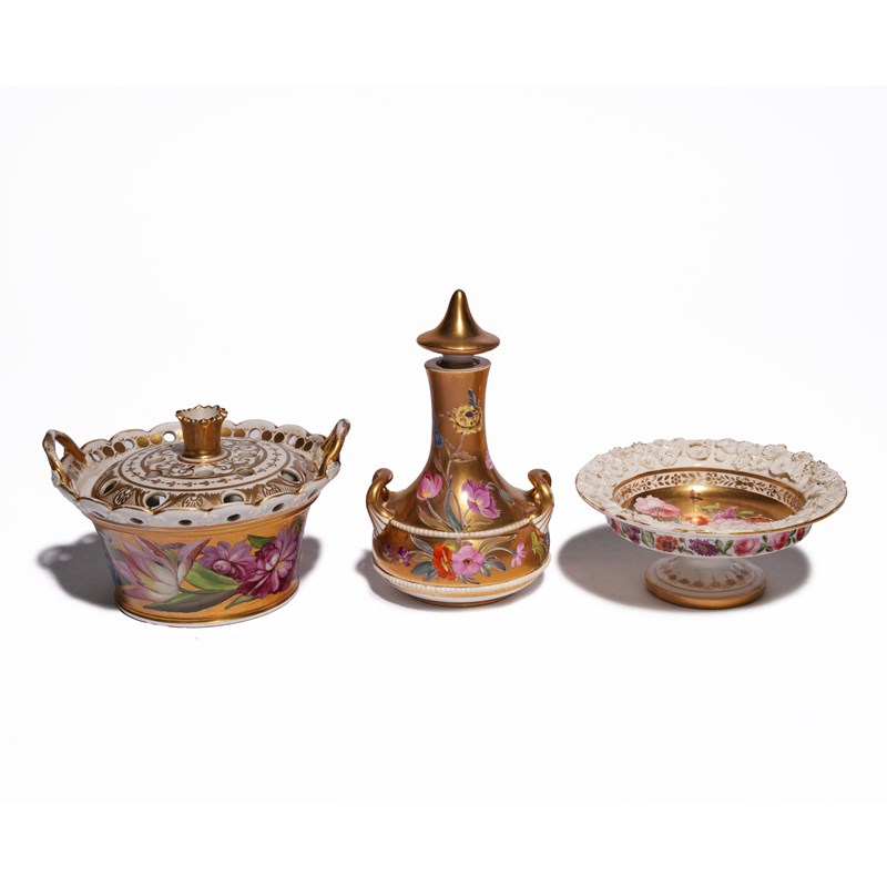painted with a band of flowers on a gilt ground, together with an ecuelle, cover and stand, a scent bottle and a small tazza with similar decoration, a pair of candlesticks and a câchepot and cover with bands of floral decoration and three plates with floral wells inside borders of gilt scrolls and motifs (15)