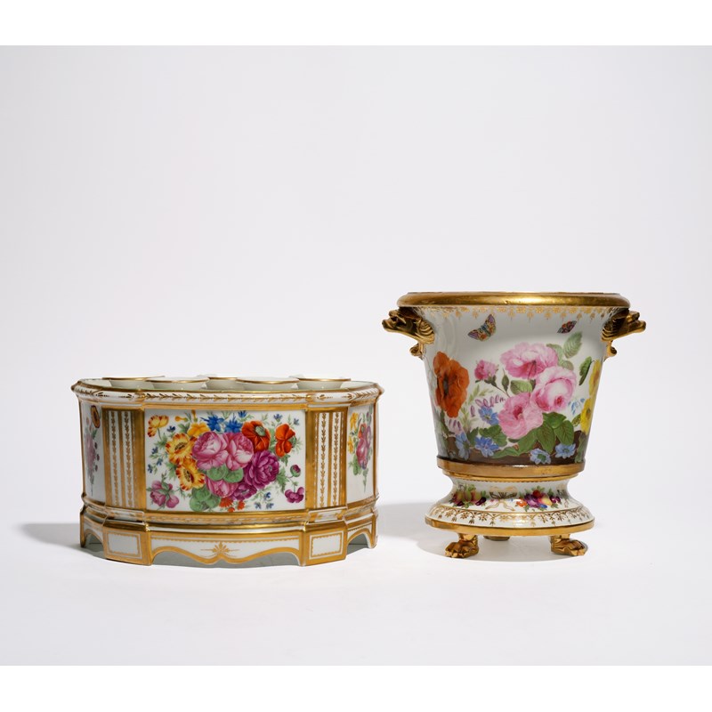 of demi-lune form painted with panels of flowers, a large Continental porcelain câchepot and stand, painted with butterflies above a continuous flower bed, spurious 'Swansea' mark, together with a group of Swansea-style items including a pair of baskets, two pair of small vases, a footed dish and an inkwell (14)