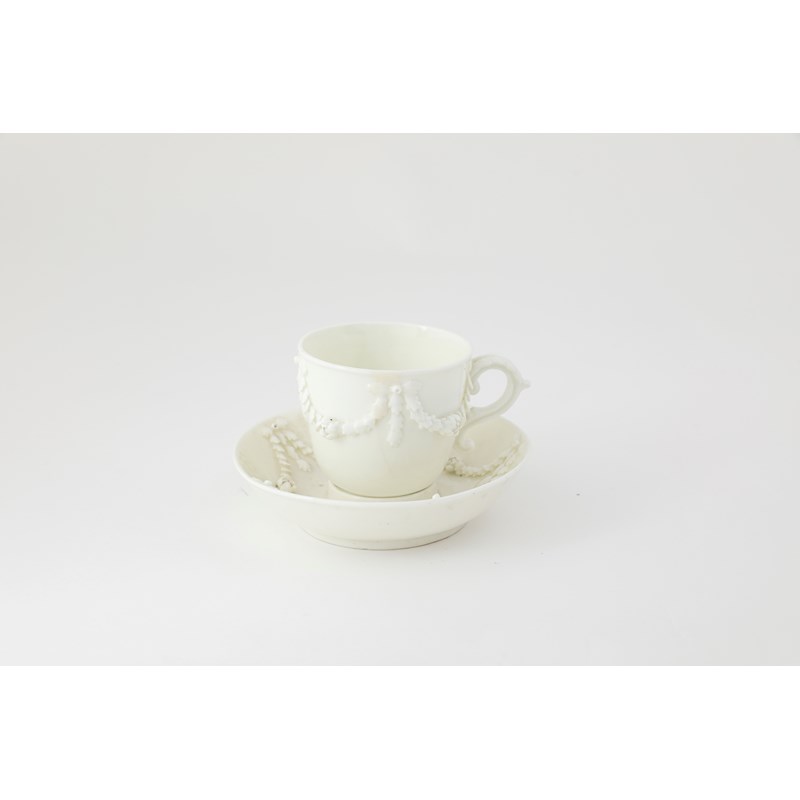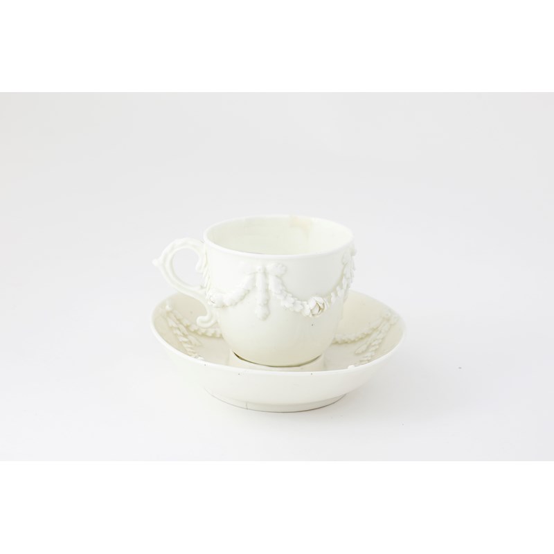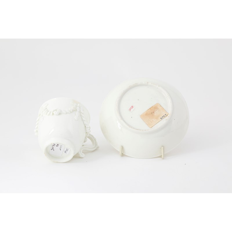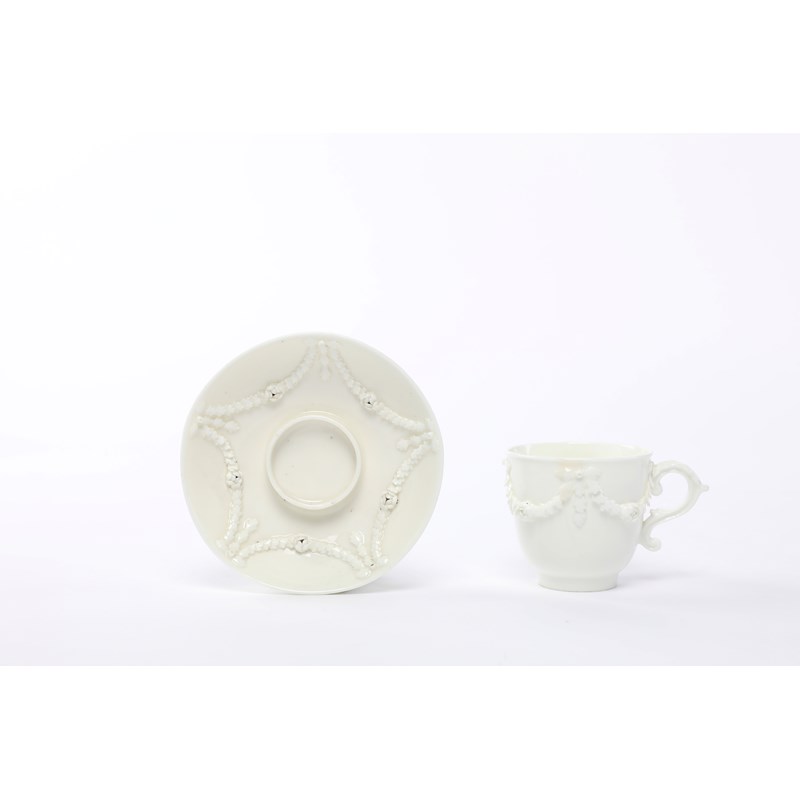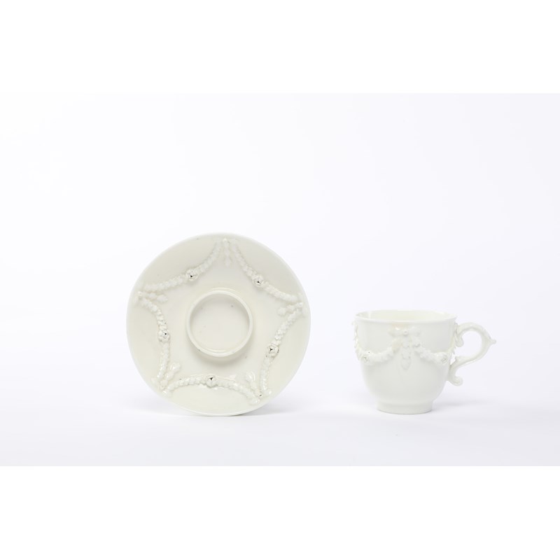 A MENNECY WHITE-GLAZED TREMBLEUSE CUP AND SAUCER