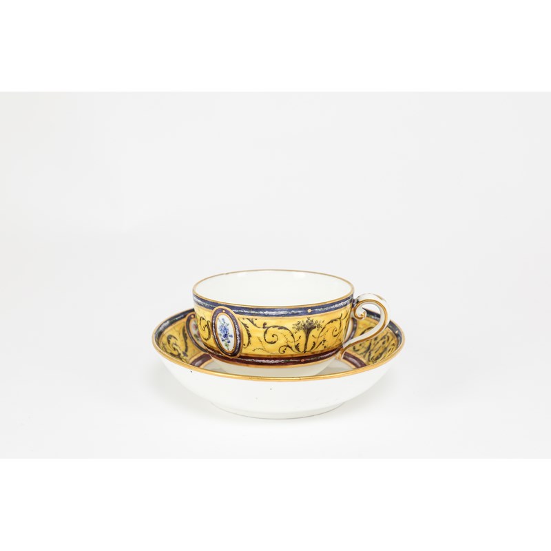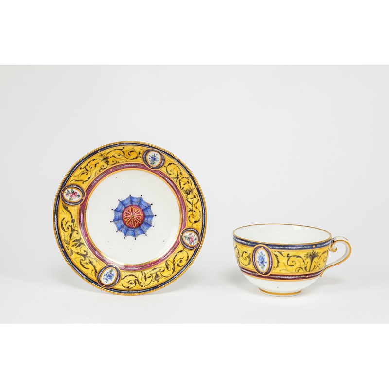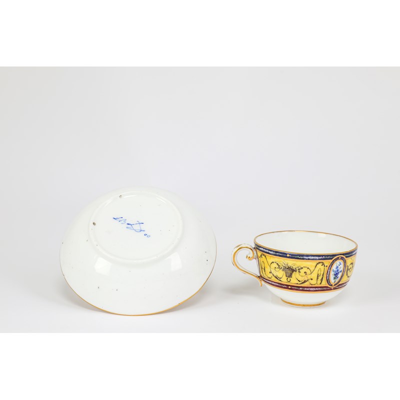 painted with a central circular fan inside a border of floral oval panels on a yellow border with scrolling classical foliage, outside decorated, blue interlaced Ls mark, decorator's mark FB (2)