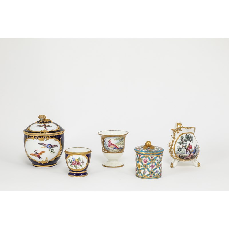 painted with exotic birds inside tooled gilt foliage, an ice cup painted with an exotic bird, a Sèvres toilet pot and cover, moulded and painted with a trellis design with roses, a Sèvres egg cup (coquetier) with floral panels on a blue ground and a Sèvres style pot and cover with birds in flight on a blue ground, all with an interlaced Ls mark (7)