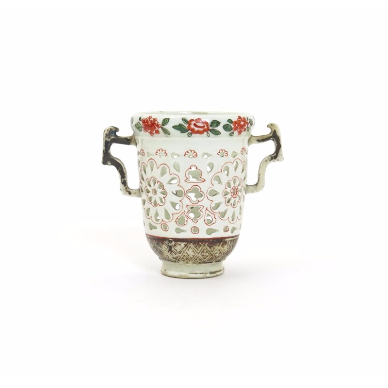 A Du Paquier two-handled beaker c.1725-30, the narrow form pierced with four large flowerheads within an arrangement of other shaped holes, all outlined in pencilled red, the everted rim with a band of Oriental flowers in red and green, the foot and shaped handles decorated with traces of a dark lustre, 7.5cm.
